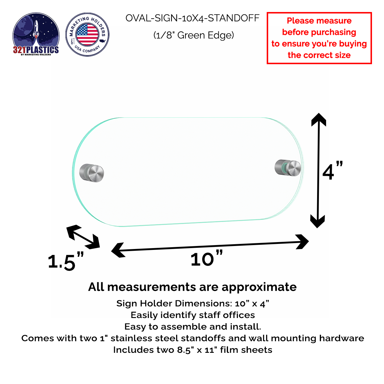 The office sign kits are designed to hold 10β x 4β inch inserts. The sign kits come with film sheets which can be printed on laser printers. This makes it easy to customize your sign with any computer. Frosted and clear film sheets are included. The unique green edged acrylic draws attention to this high end door plate. These signs secure to an office door or wall with the included standoffs and hanging hardware.Β
