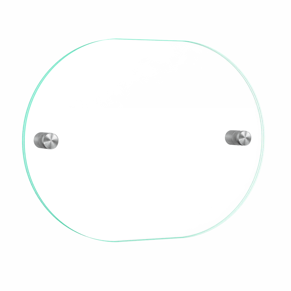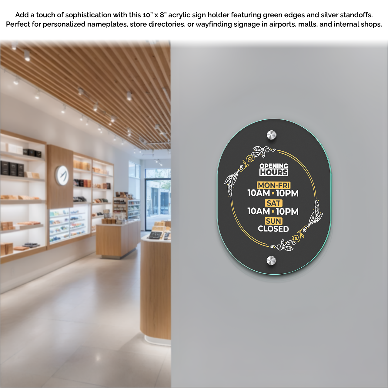 These uniquely shaped acrylic sign frame measures 10β x 8" overall with green edged plates to display your printed materials in a business setting. Modern contemporary design features. Nameplates are great for identifying an office, restroom, or conference room. The subtle green tint of this specialty acrylic replicates the look of glass, offering sophistication with durability.