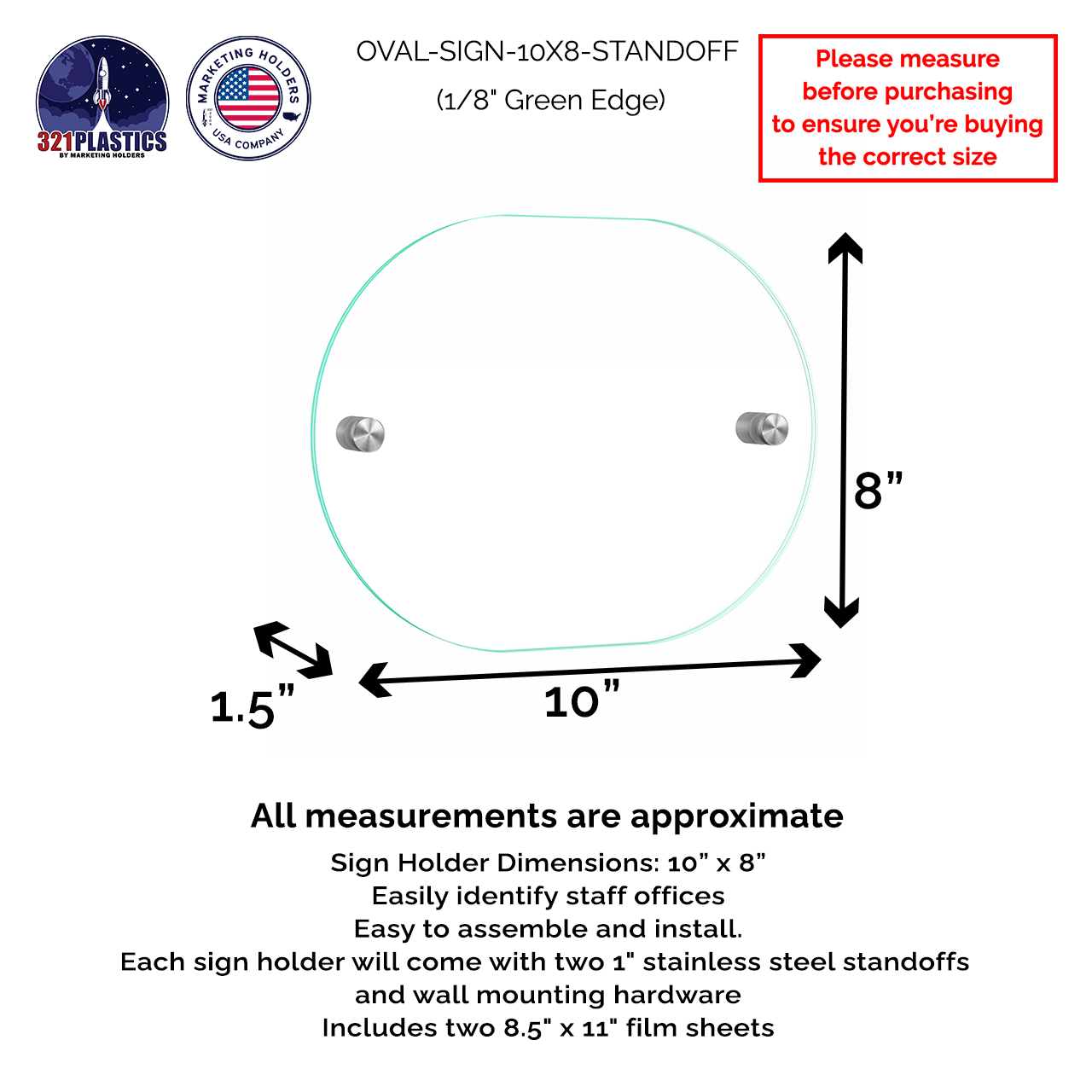 The office sign kits are designed to hold 10β x 8β inch inserts. The sign kits come with film sheets which can be printed on laser printers. This makes it easy to customize your sign with any computer. Frosted and clear film sheets are included. The unique green edged acrylic draws attention to this high end door plate. These signs secure to an office door or wall with the included standoffs and hanging hardware.Β