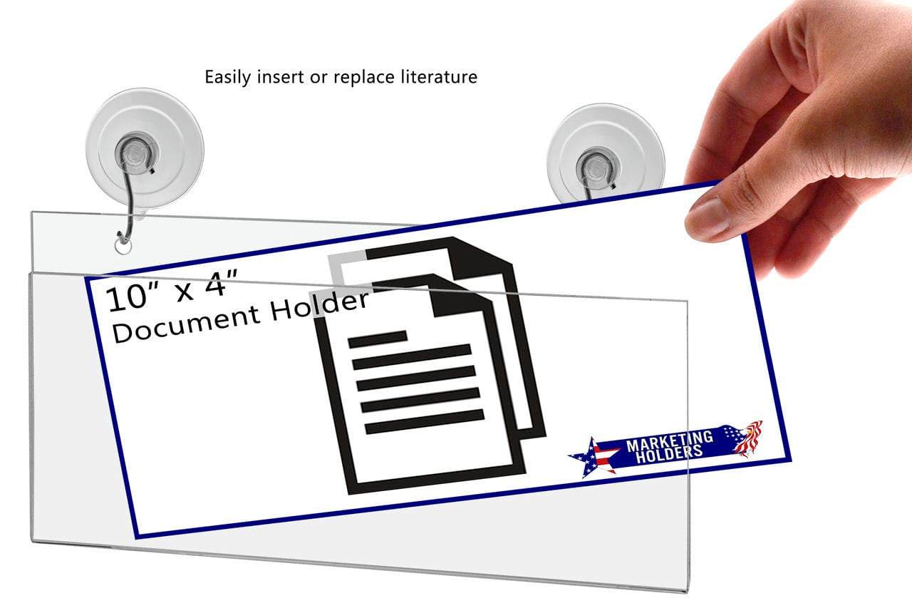Marketing Holders clear acrylic sign holder is perfect for displaying signage or posting temporary notices for employees or customers in entryways, glass doors and windowed front desk enclosures. Use them to display signage for special events, sales, store or office hours. Ideal for use at retail stores, restaurants, financial institutions, business offices and more!