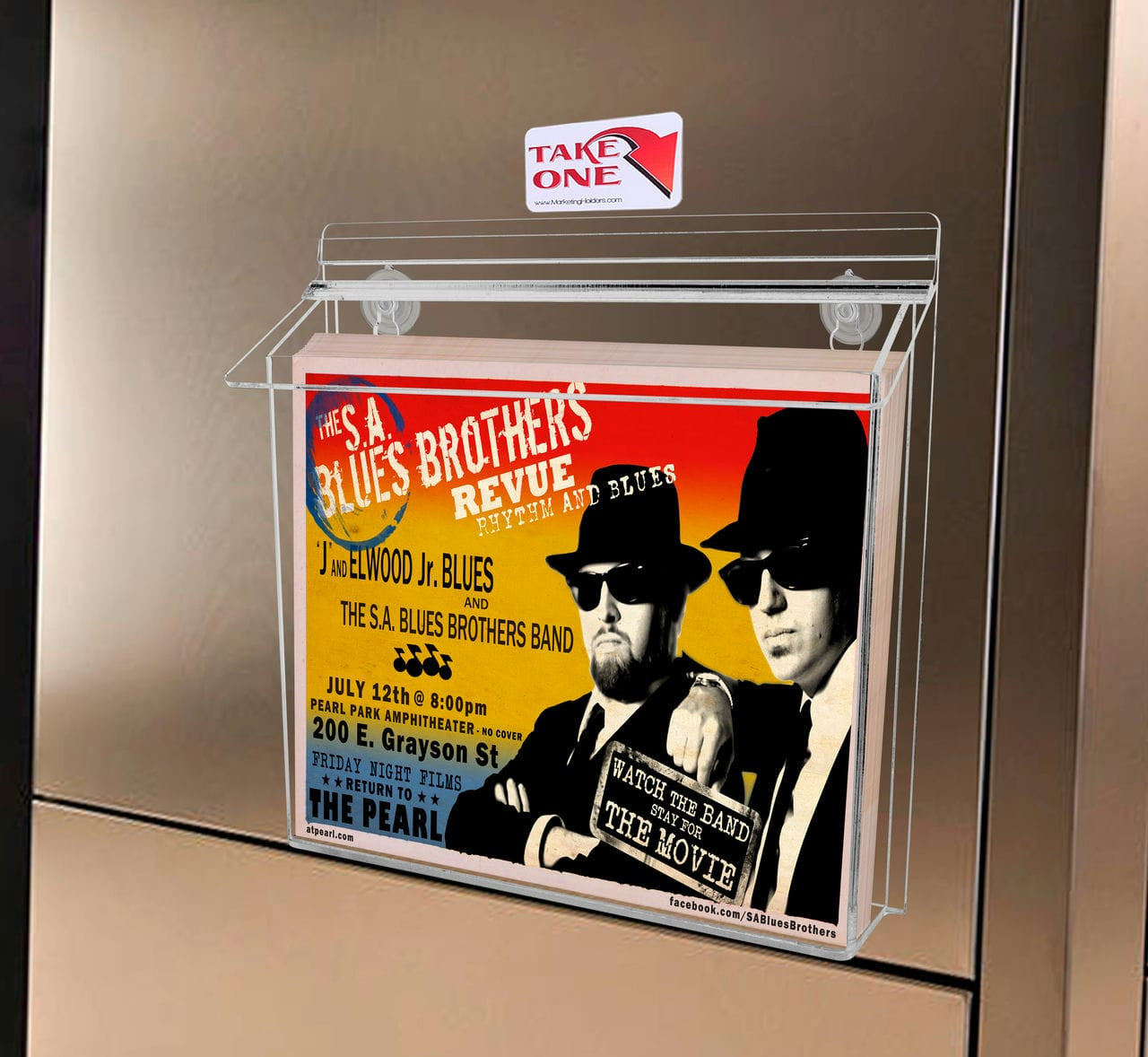 - Includes: Outdoor advertisement holder with lid, suction cups and “Take One” sticker