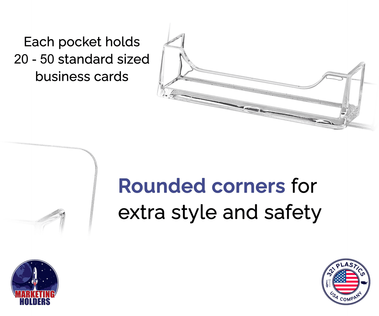 This slant back double pocket business card holder is designed to hold and display multiple sets of business cards, gift cards, appointment cards or any other 3.5”W x 2”H printed material. Made of durable plastic acrylic, the card holder can be conveniently placed on desks, tables, retail counters or anywhere you want to leave your cards for customers to take one.