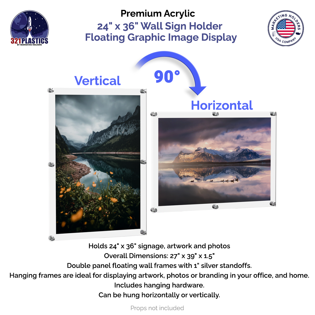Give your poster size prints and photos the gallery treatment with our elegant stylish lucite frames. These contemporary wall frames are fabricated with two panels of clear acrylic and silver standoffs to elevate the look of any room. Hang these beautiful acrylic frames in boutiques, museums, trade shows, hotel lobbies, restaurants, retail stores, schools, at work or at home. These modern artwork frames can be used horizontally or vertically when mounting them to walls and doors. Â