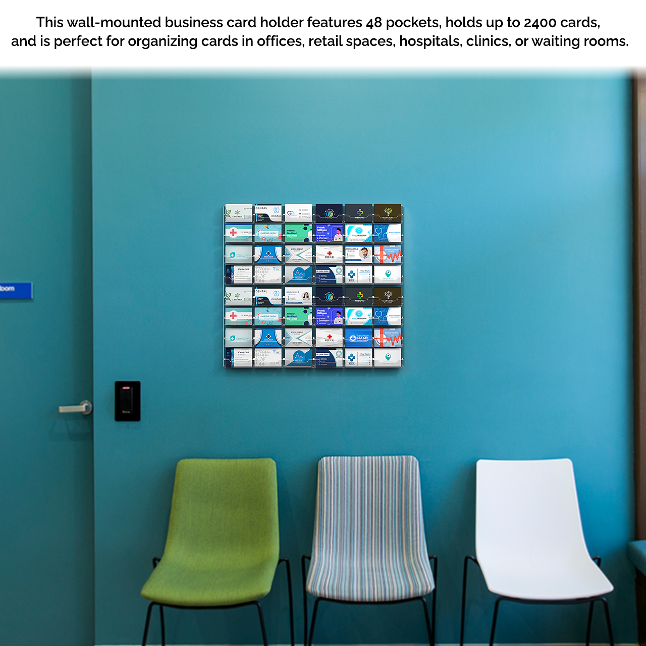 This 48 pocket contact card rack is the perfect space saving choice for large office buildings or business centers. This thick polycarbonate wall mount business card holder provides a sturdy display for business, gift or appointment cards that complements any decor. These multi slot card racks are great space savers and help you keep counters free and clear of clutter!