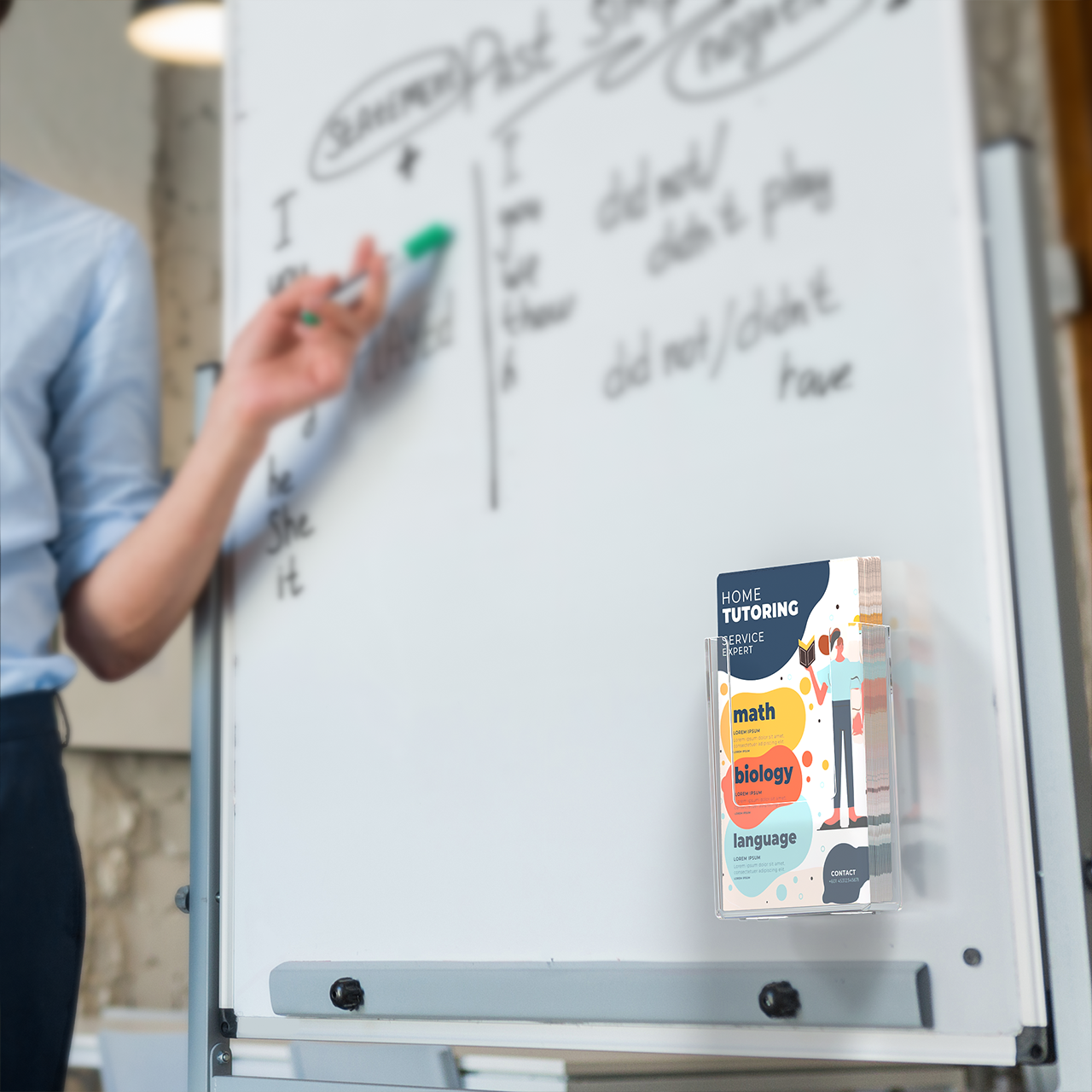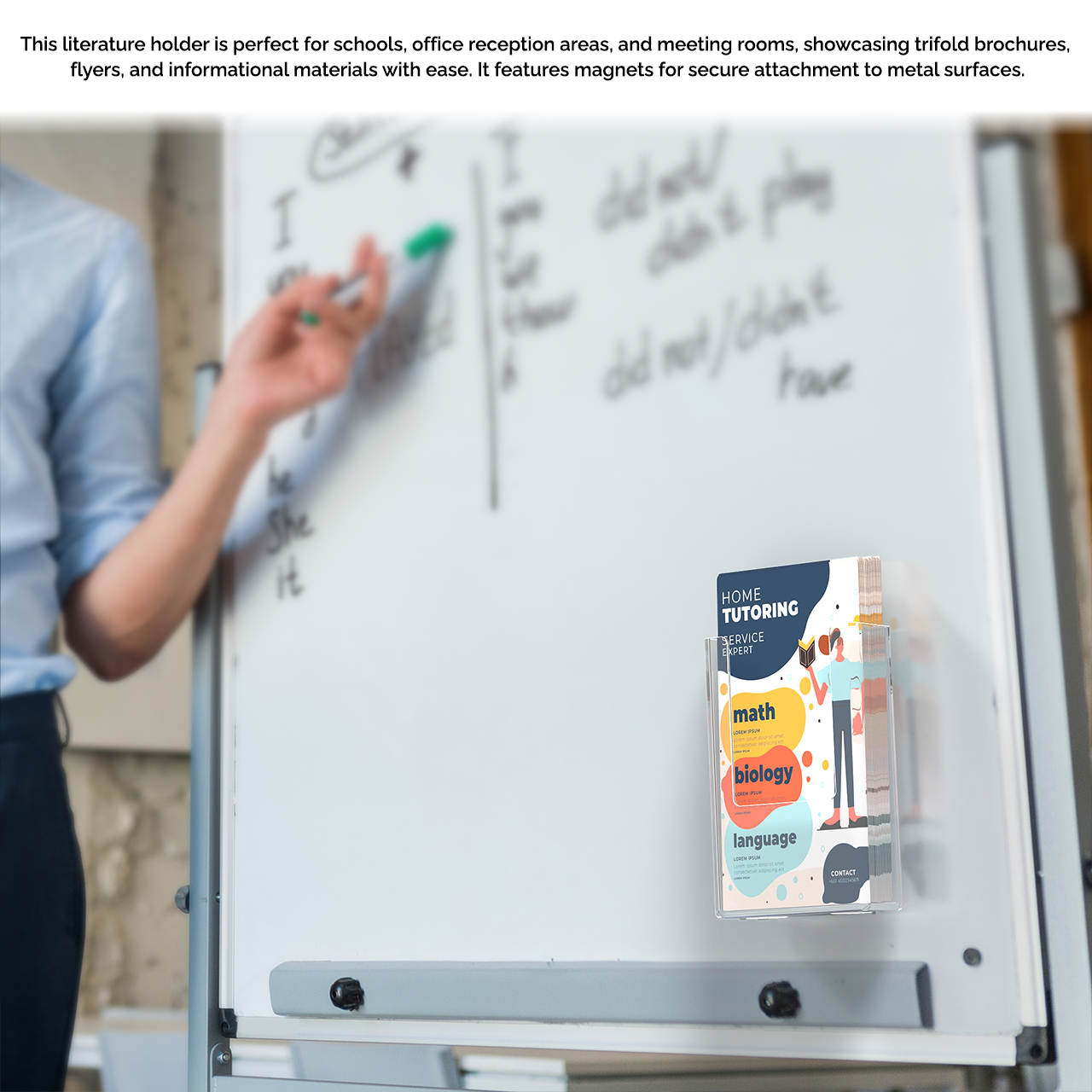 Made of durable clear plastic such as acrylic, plexiglass, lucite and PETG polycarbonate materials. The brochure holder features a clear see-through pocket that offers a full view of your printed advertisements or media. It also allows easy access for pamphlet removal and comes with strong magnets for simple installation on smooth, metal surfaces. This holder is a great addition in high-traffic areas where you want to display and provide your promotional literature for the taking.