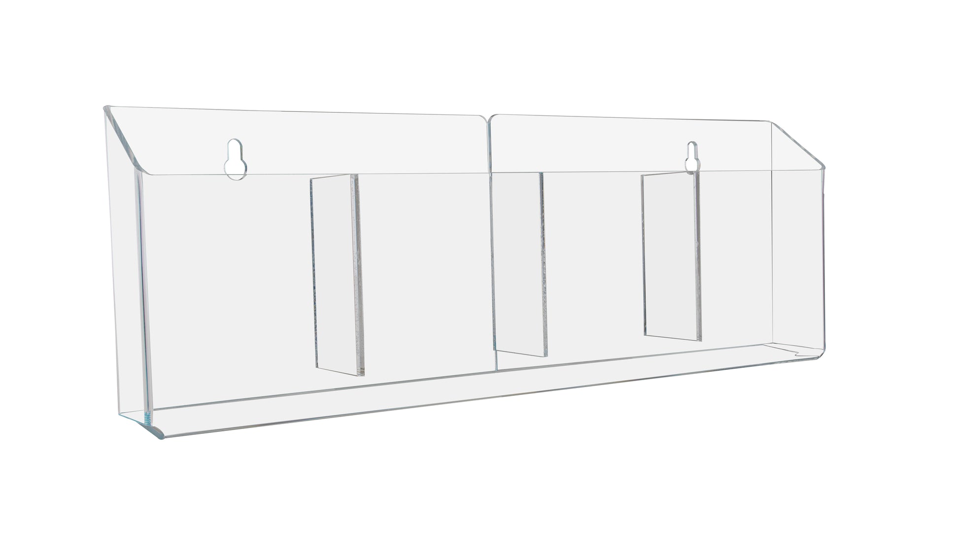 The organizers are made of durable clear plastic such as acrylic, plexiglass, lucite and PETG polycarbonate materials. The brochure holder features three clear see-through pocket that offers a view of your printed advertisements and media. This economical rack card display stand is a great addition in high-traffic areas where you want to display and provide your promotional literature and contact information for the taking. This organizer is the perfect solution to display your advertising materials in a crowded or small location where there is limited space.