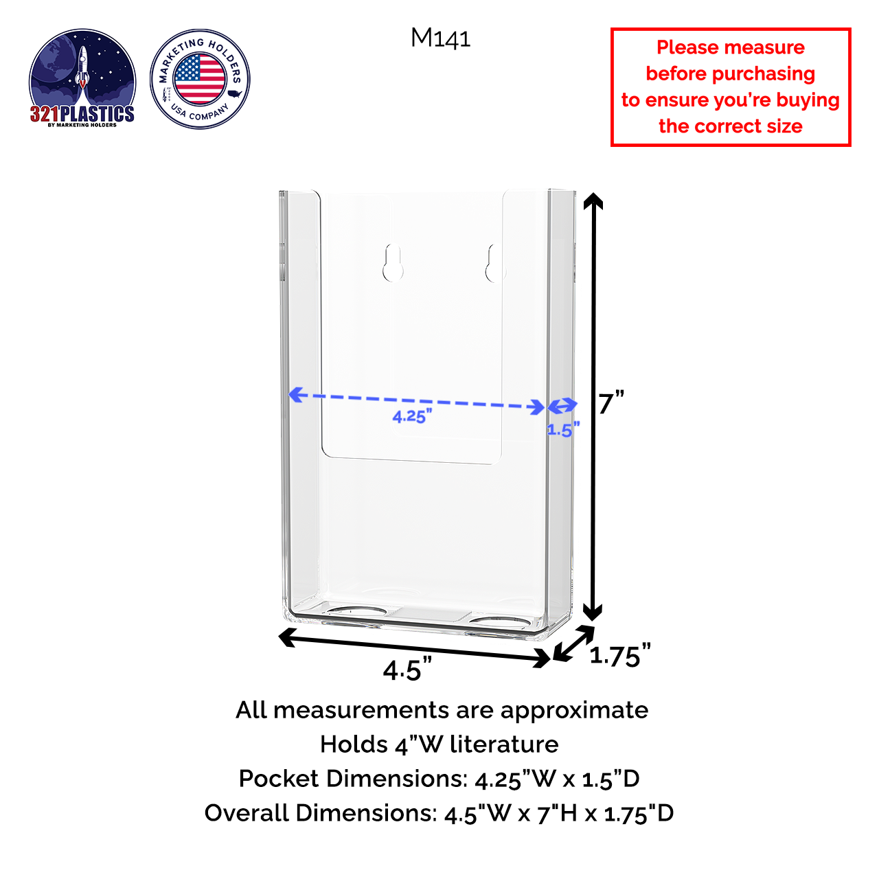 - Overall Dimensions: 4.5"W x 7"H x 1.75"D