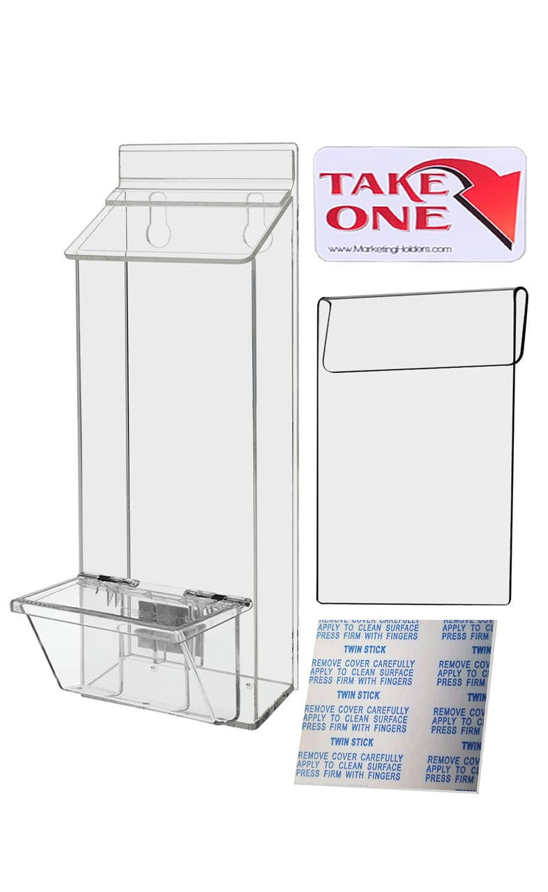 - Includes: Brochure Holder with lid, business card box, window hook, adhesive strips and one “Take One” sticker