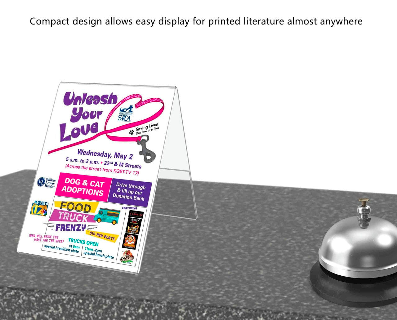 - Display on desks, tables, and counters at events, in restaurants, bars, retail stores, trade show booths, hotels and other business locations