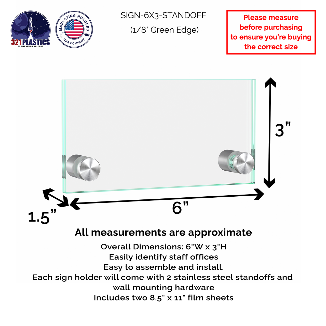 The office sign kits are designed to hold 6β x 3β inch inserts. The sign kits come with film sheets which can be printed on laser printers. This makes it easy to customize your sign with any computer. Frosted and clear film sheets are included. The unique green edged acrylic draws attention to this high end door plate. These signs secure to an office door or wall with the included standoffs and hanging hardware.Β