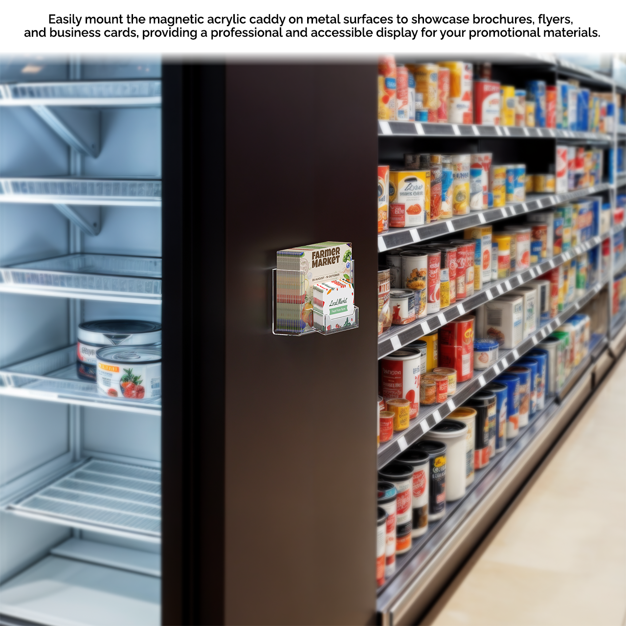 In addition to brochures, the acrylic caddy has a business card pocket that can also be used to display other small media like Security Gate Code Cards, Membership Cards, Appointment Cards, VIP Cards, ID Badges, Security Cards or Gift Cards. These caddies can be attached to metal signs and posts, filing cabinets, refrigerators, dry erase boards, metal cubicles and other smooth metal surfaces without any damage or residue.