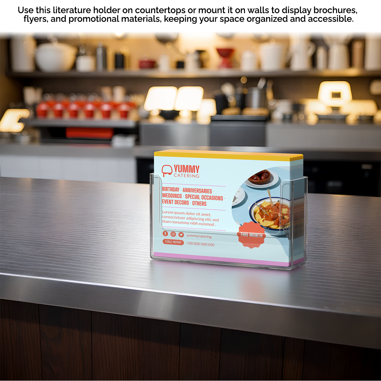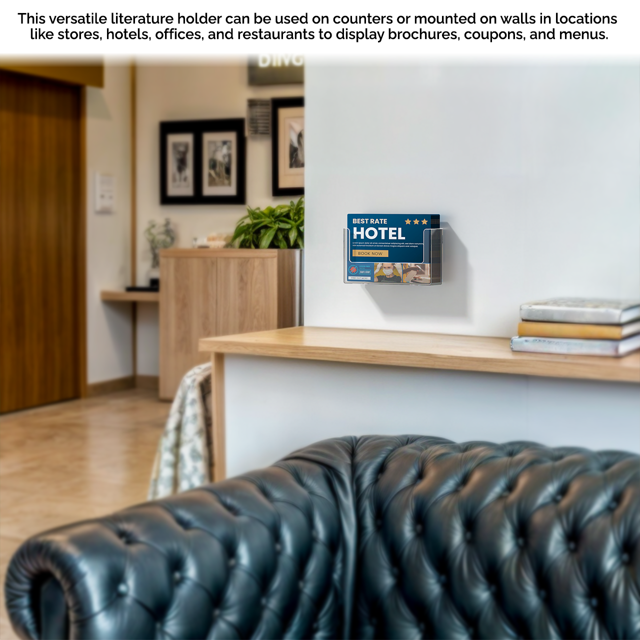 Marketing Holders literature holder provides a simple yet effective tabletop or hanging display for promotional literature, pamphlets, brochures and flyers. Many businesses find these marketing aids useful to spread the word about their upcoming promotions, products, services and events. These heavy duty stands can be used on flat surfaces such as tops of a table, counter or desk near entrances and exits or reception areas so customers are prompted to take one when visiting your business. This holder comes with 2 pre-drilled keyholes and is designed to easily hang on smooth surfaces if counter space is limited.  Elegantly showcase attraction pamphlets or menus while saving space and keeping areas looking professional, clutter free and organized. These multi use bins are versatile and can be used to store a variety of other items.