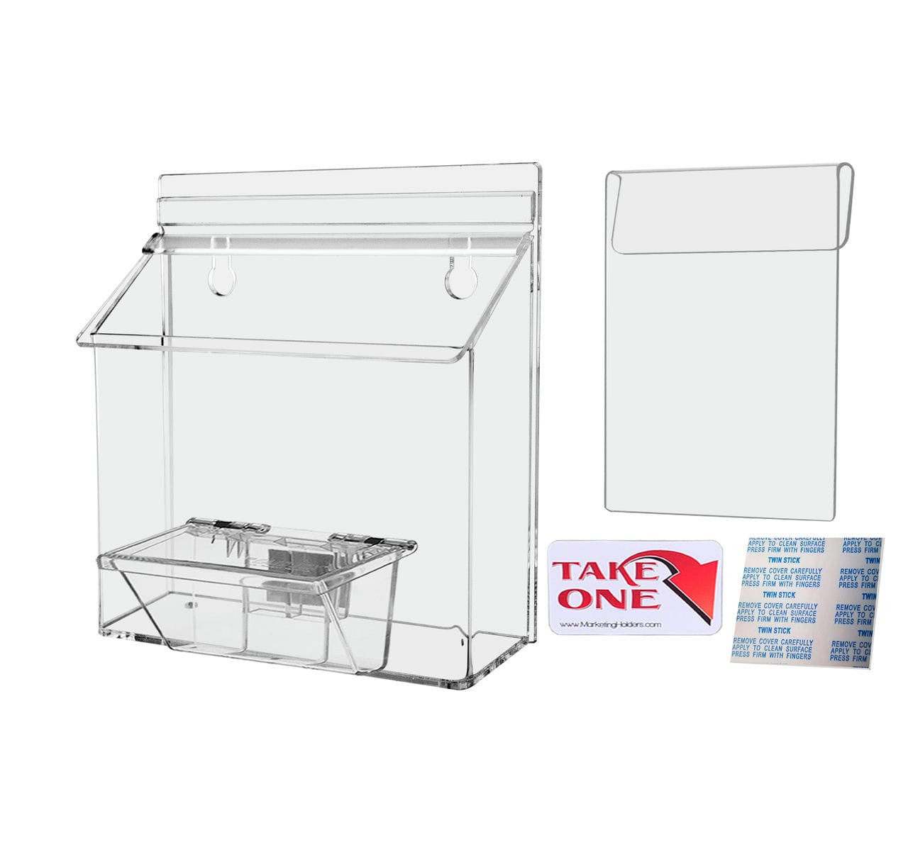 - Includes: Postcard Holder with lid, business card box, window hook, adhesive strips and one “Take One” sticker