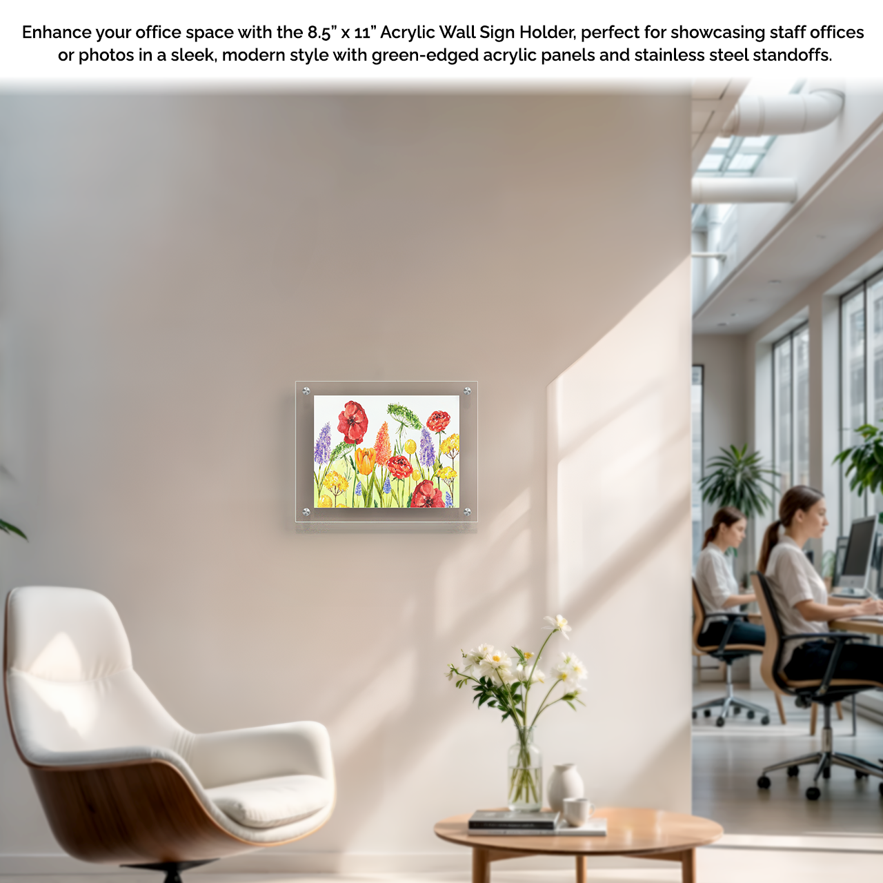 These acrylic wall sign frame measures 8.5β x 11" overall with green edged plates to display your printed materials in a business setting. Modern contemporary design features. Nameplates are great for identifying an office, restroom, or conference room. The subtle green tint of this specialty acrylic replicates the look of glass, offering sophistication with durability.