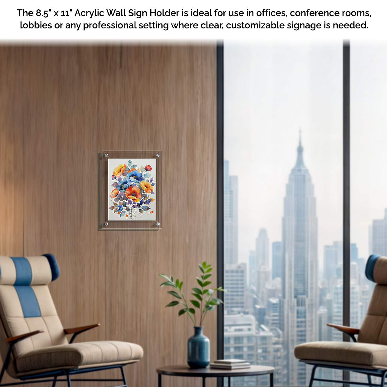 These wall mount sign holders add elegance to your professional environment with acrylic wall mount frames with silver standoffs. Frames can be used vertically or horizontally. When installed the display will stand 0.75" away from the wall, giving the display a stylish contemporary appearance.