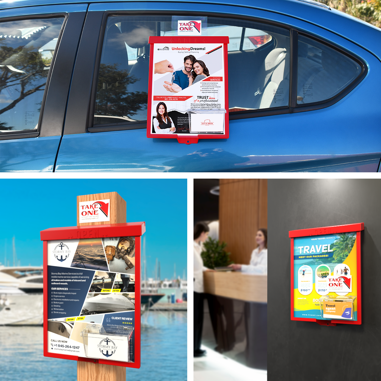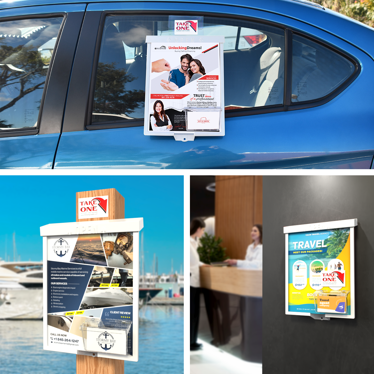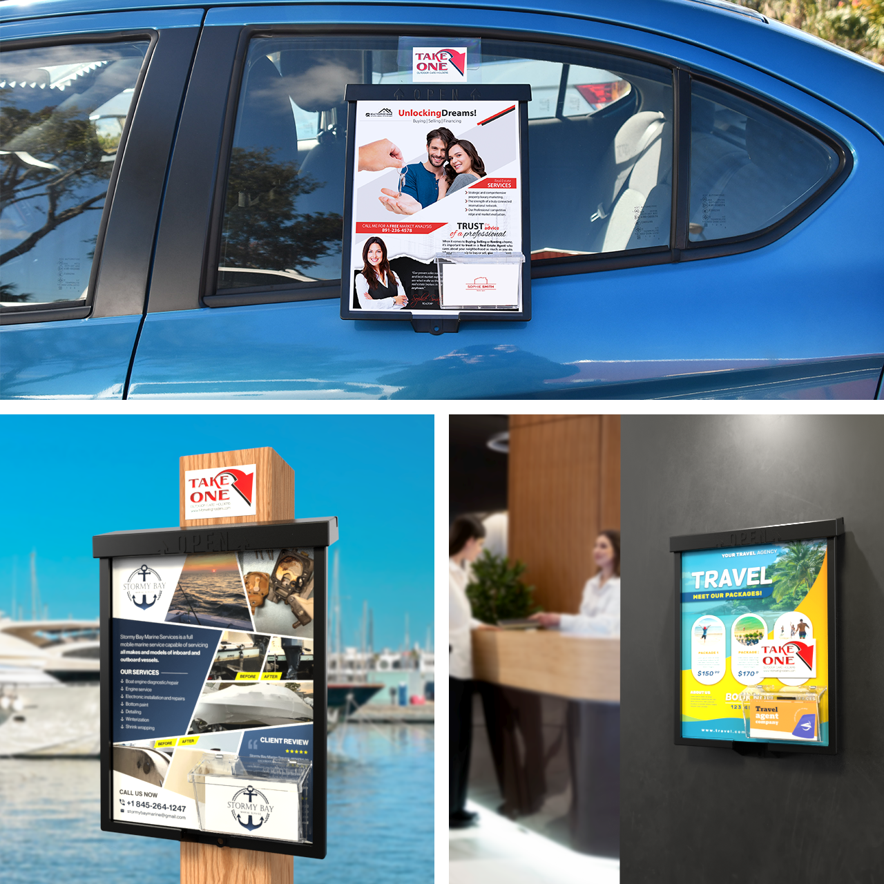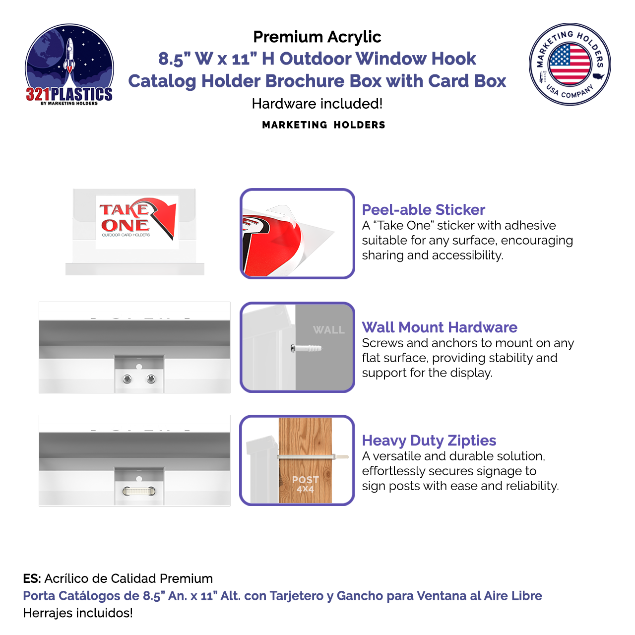 - Includes: Brochure Holder with lid, window hook, adhesive, business card box, a zip tie, set of screws and One “Take One” sticker