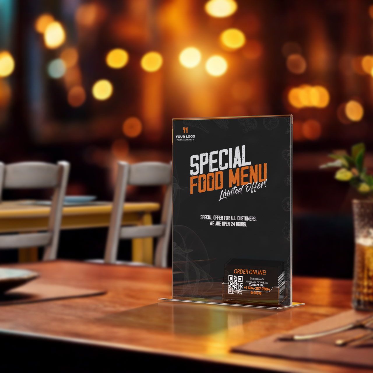 - Display on desks, tables, and counters in restaurants, bars, retail stores, trade show booths, hotels and other business locations