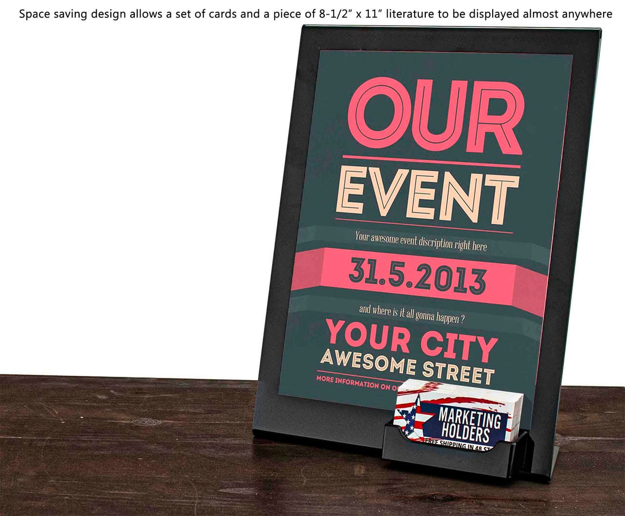 - Holds 8.5"W x 11"H literature and standard 3.5"W business cards.