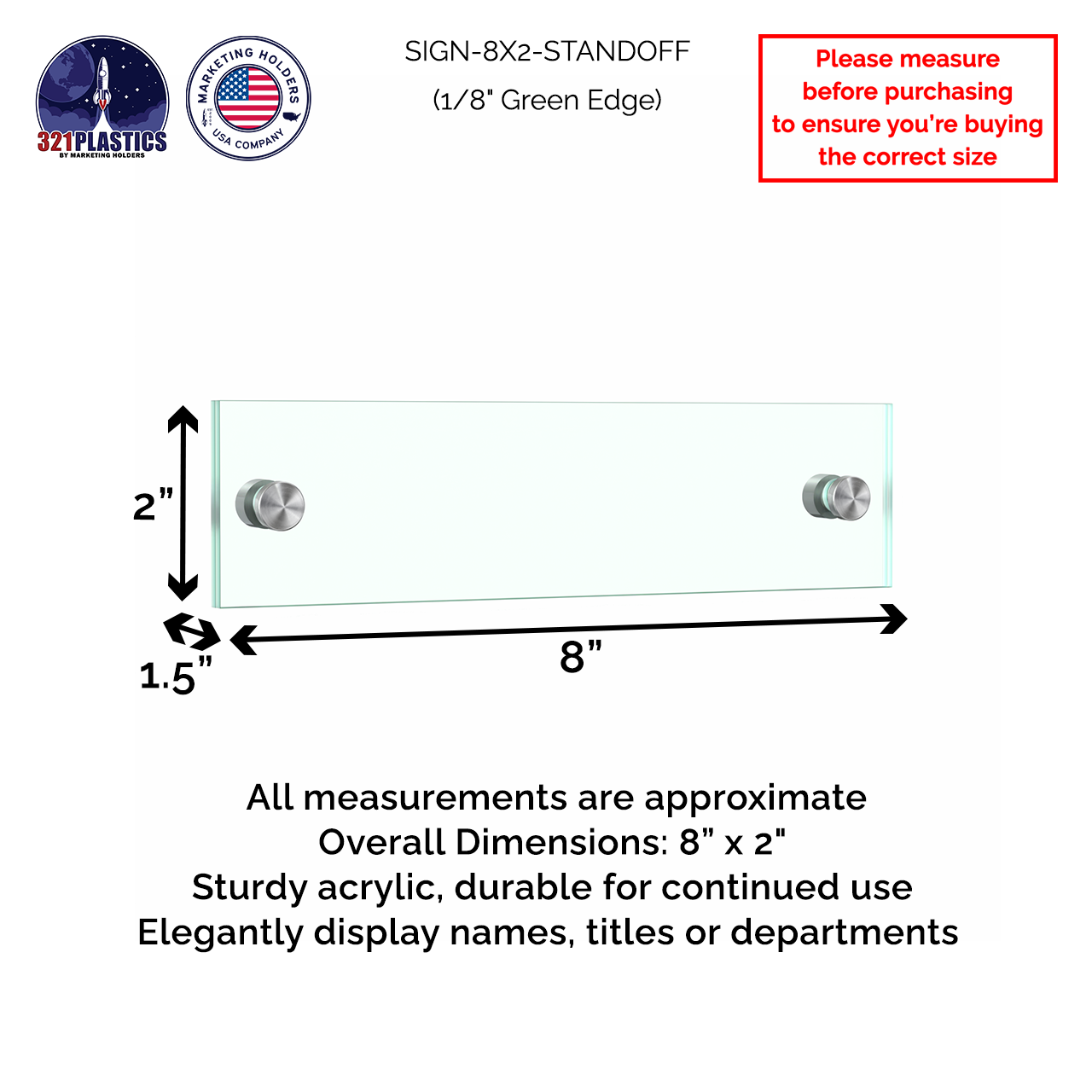 These unique acrylic door name plates measure 8”W x 2"H overall with green edged plates to display your printed materials in a business setting. Modern contemporary design features. Nameplates are great for identifying an office, restroom, or conference room. The subtle green tint of this specialty acrylic replicates the look of glass, offering sophistication with durability.