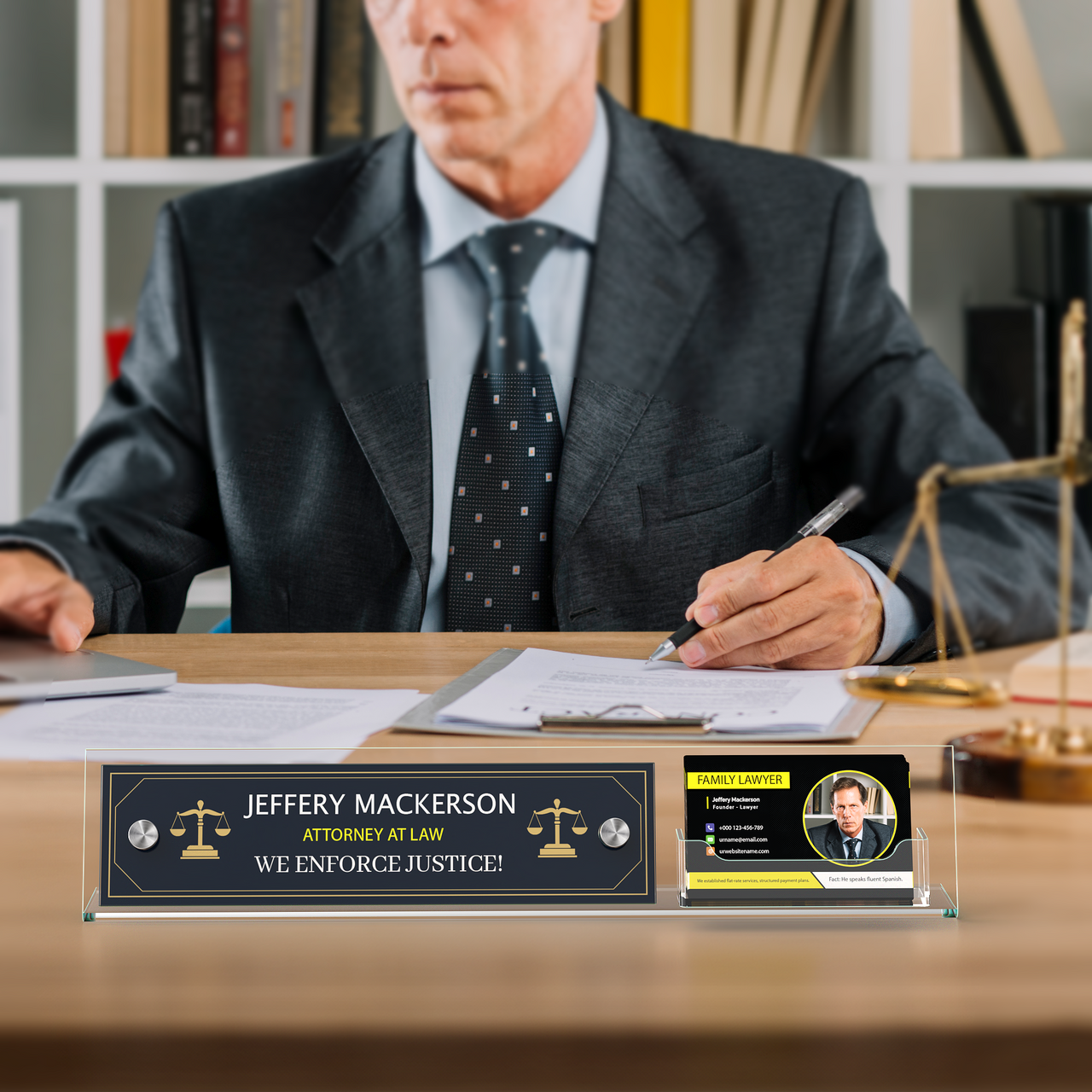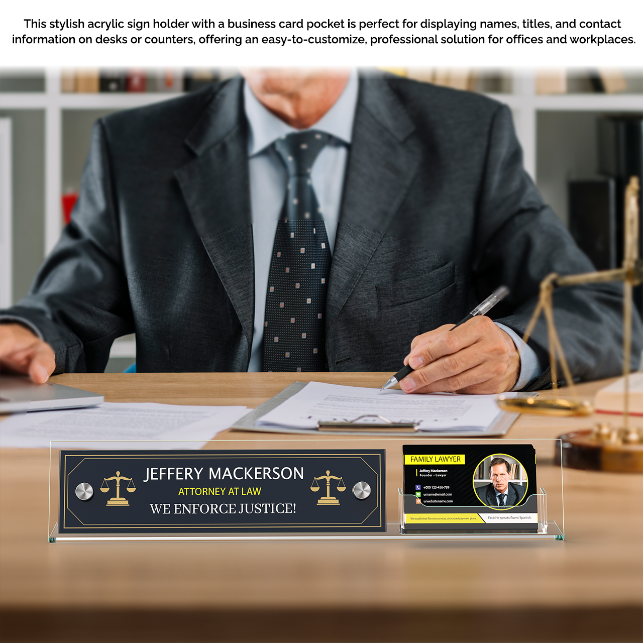 8"W x 2"H Slanted Elegant Tabletop Euro Style Nameplate Desk Frame with Business Card Pocket and Silver Standoffs