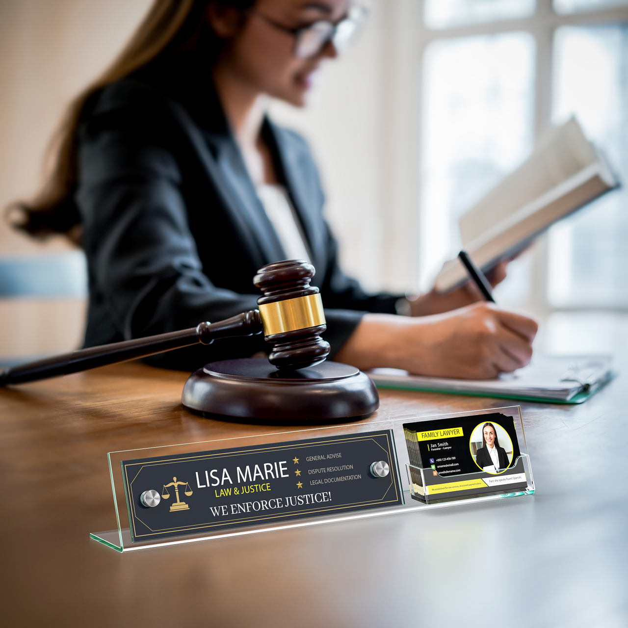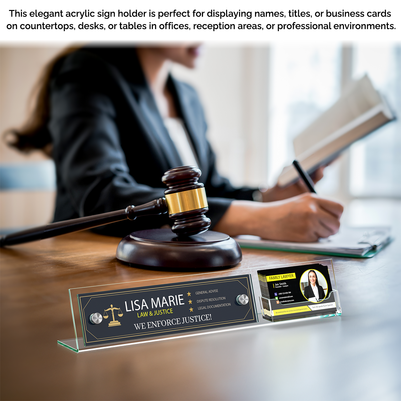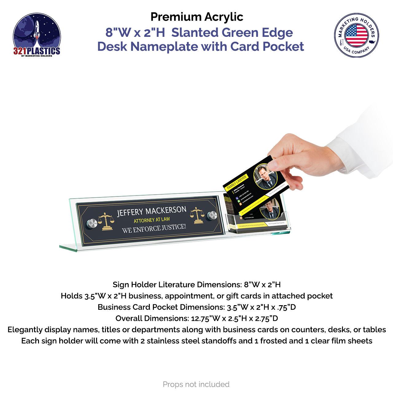 These angled acrylic desktop nameplate holder with business card pocket holds 8”W x 2"H printed media. This unique desk sign has green edged plates to display your printed materials in a business setting. Modern contemporary design features with display any sign with elegance and efficiency. Perfect for workplace signage and contact information cards on countertops or desks. The subtle green tint of this specialty acrylic replicates the look of glass, offering sophistication with durability. These sign holders add elegance to your professional environment with silver standoffs.