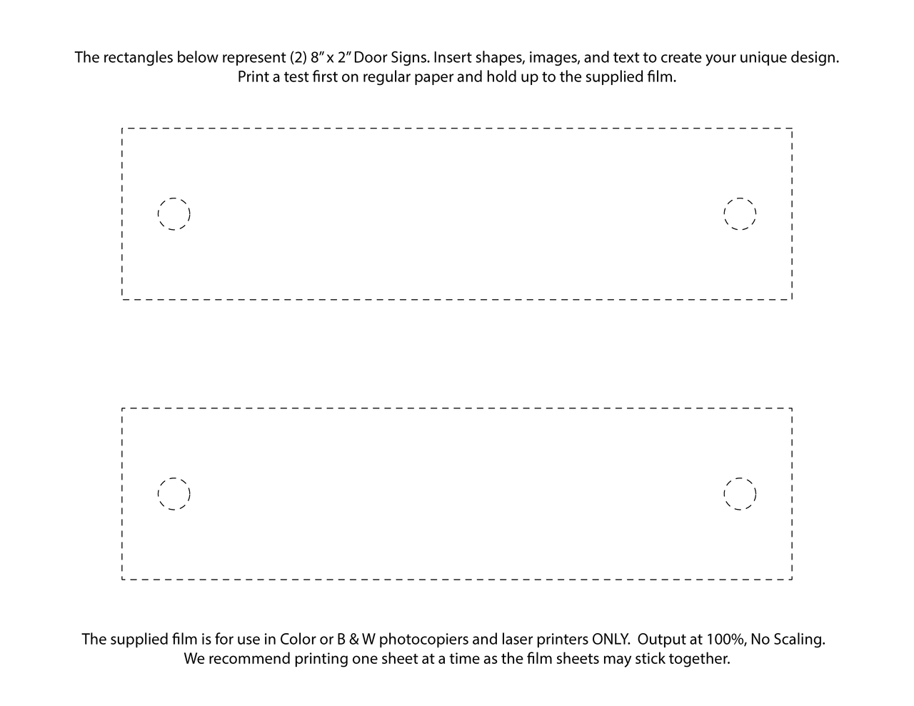 These modern signs are a do-it-yourself printing system, which saves your company money. Â Use your own design or download a template for Microsoft Word, Adobe Illustrator or Photoshop format. Then, using a laser printer or copier, print the design on either clear or frosted film, included in the kit. Trim and assemble the graphic in between both of the acrylic panels.