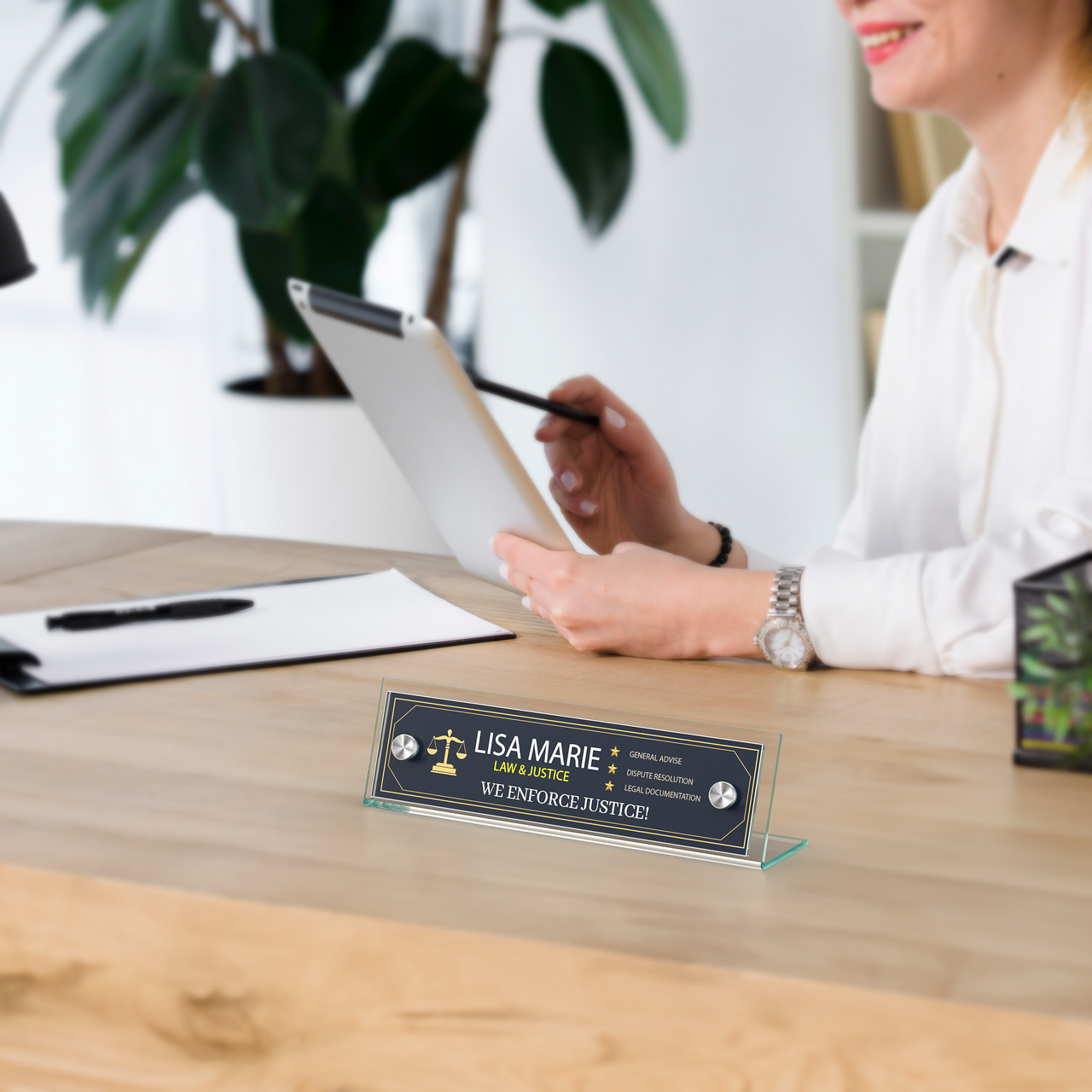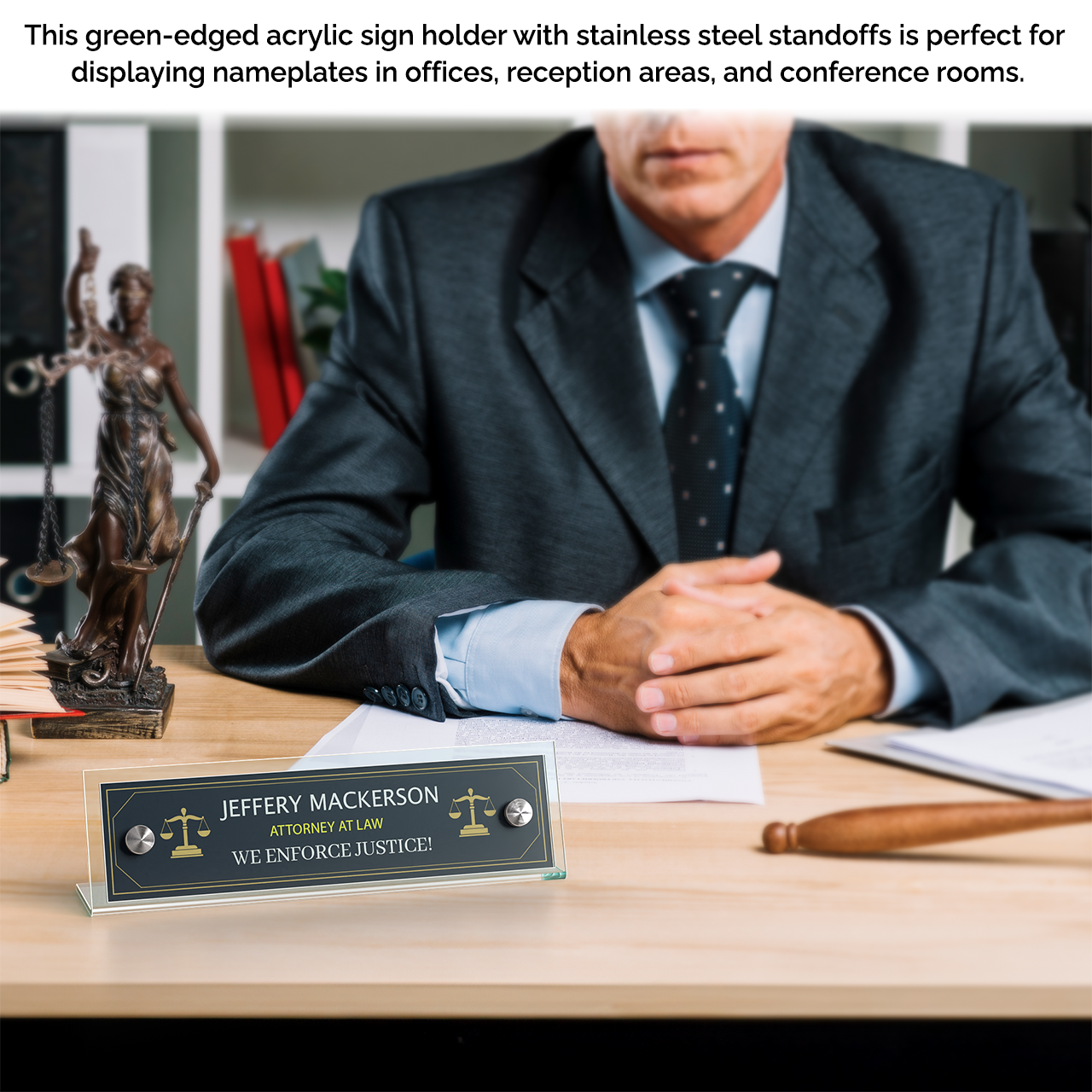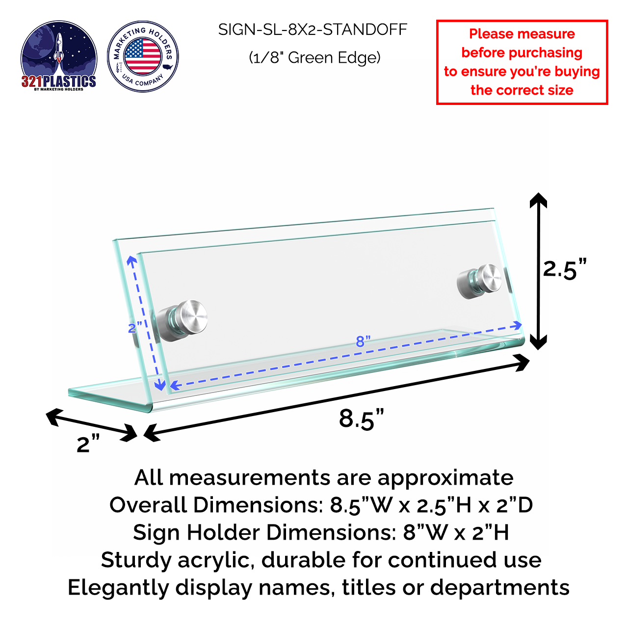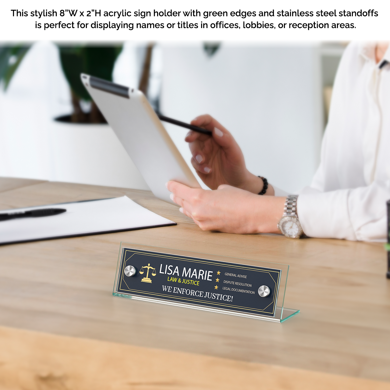 These angled acrylic tabletop sign frame measures 8”W x 2"H overall with green edged plates to display your printed materials in a business setting. Modern contemporary design features with display any sign with elegance. The subtle green tint of this specialty acrylic replicates the look of glass, offering sophistication with durability. These sign holders add elegance to your professional environment with silver standoffs.Â