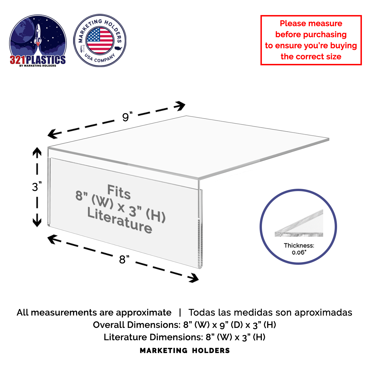 - Overall Dimensions: 8"W x 3"H x 9"D with a shelf rest 8"W x 3"H
