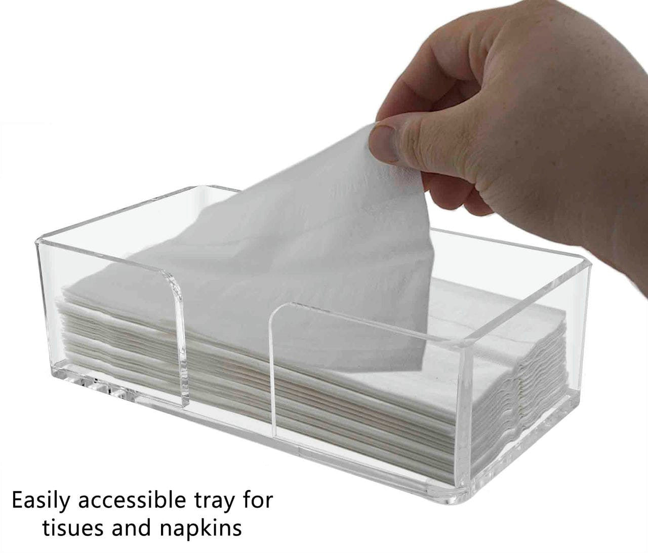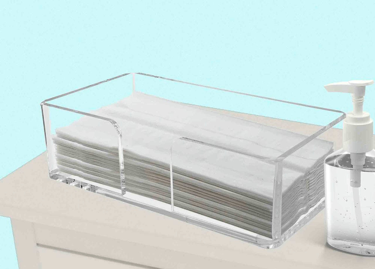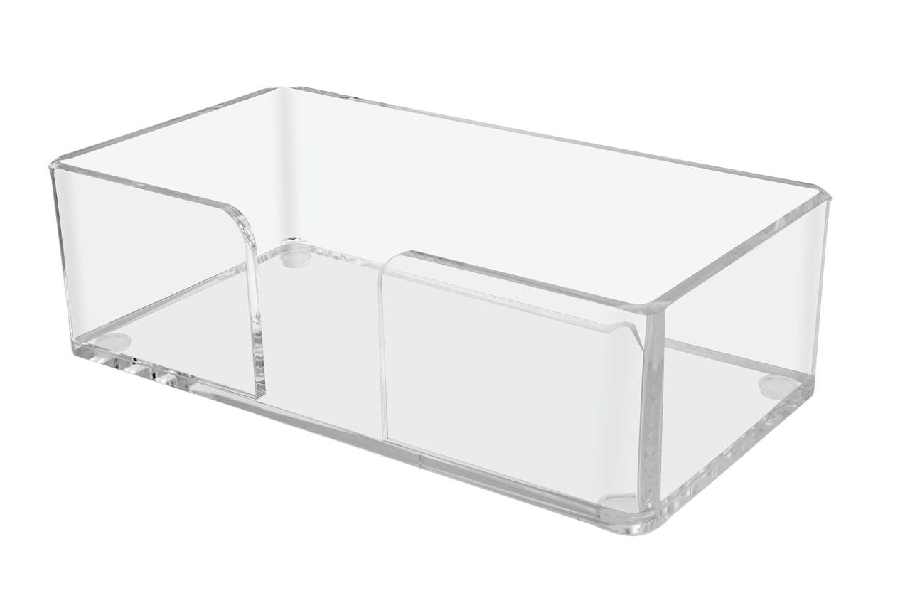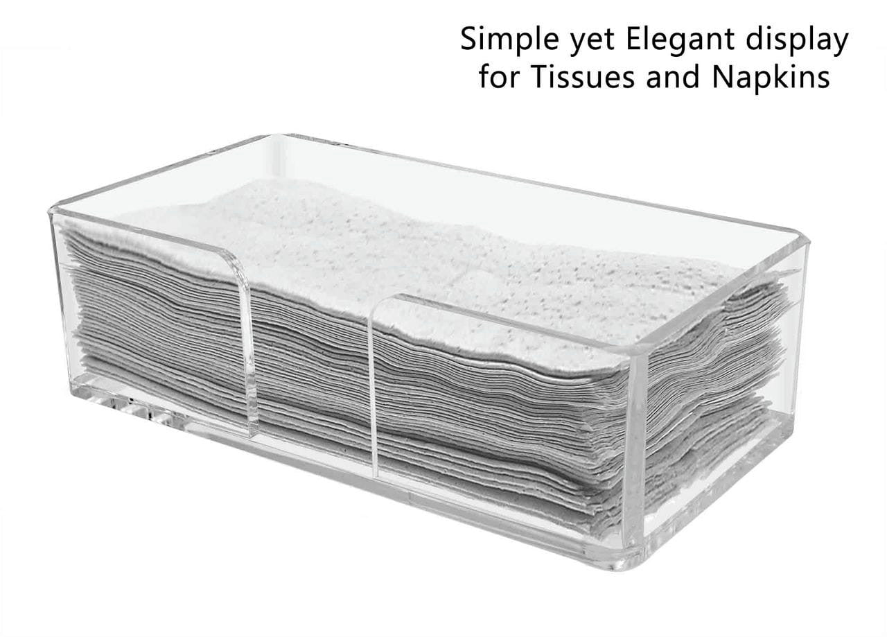Hand towel holders are essential to have as a bathroom accessory in any home, office, hotel, restaurant or retail shop. Use this holder to easily provide your guests with paper hand towels. Our dispenser sits on any countertop with non skid rubber bumpers. The open top makes restocking quick for staff members. This lucite napkin holder is designed with a smooth opening that gives clear access to tissues or disposable hand towels making it super easy to grab when you need one. This guest towel holder has a clear glossy finish making it elegant for any room.
