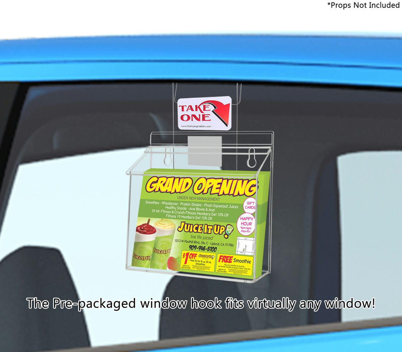 Marketing Holders window hook brochure holders make sure you never miss out on potential customers. With the acrylic literature holder, your car becomes an advertising tool. Whether you travel to the mall, supermarket, or events, these brochure holders make sure you never miss out on potential customers. These mounts are perfect to be placed on parked vehicle windows at car shows, automobile dealerships, or in showrooms to present customers with marketing or contact information. Simply mount your brochure box by attaching the hook on the outside of the vehicle window.