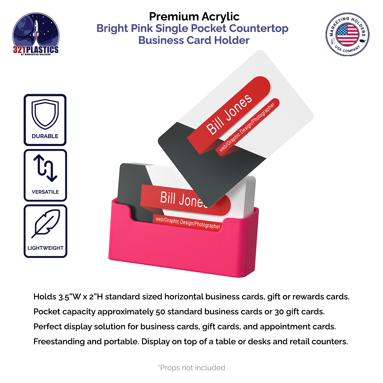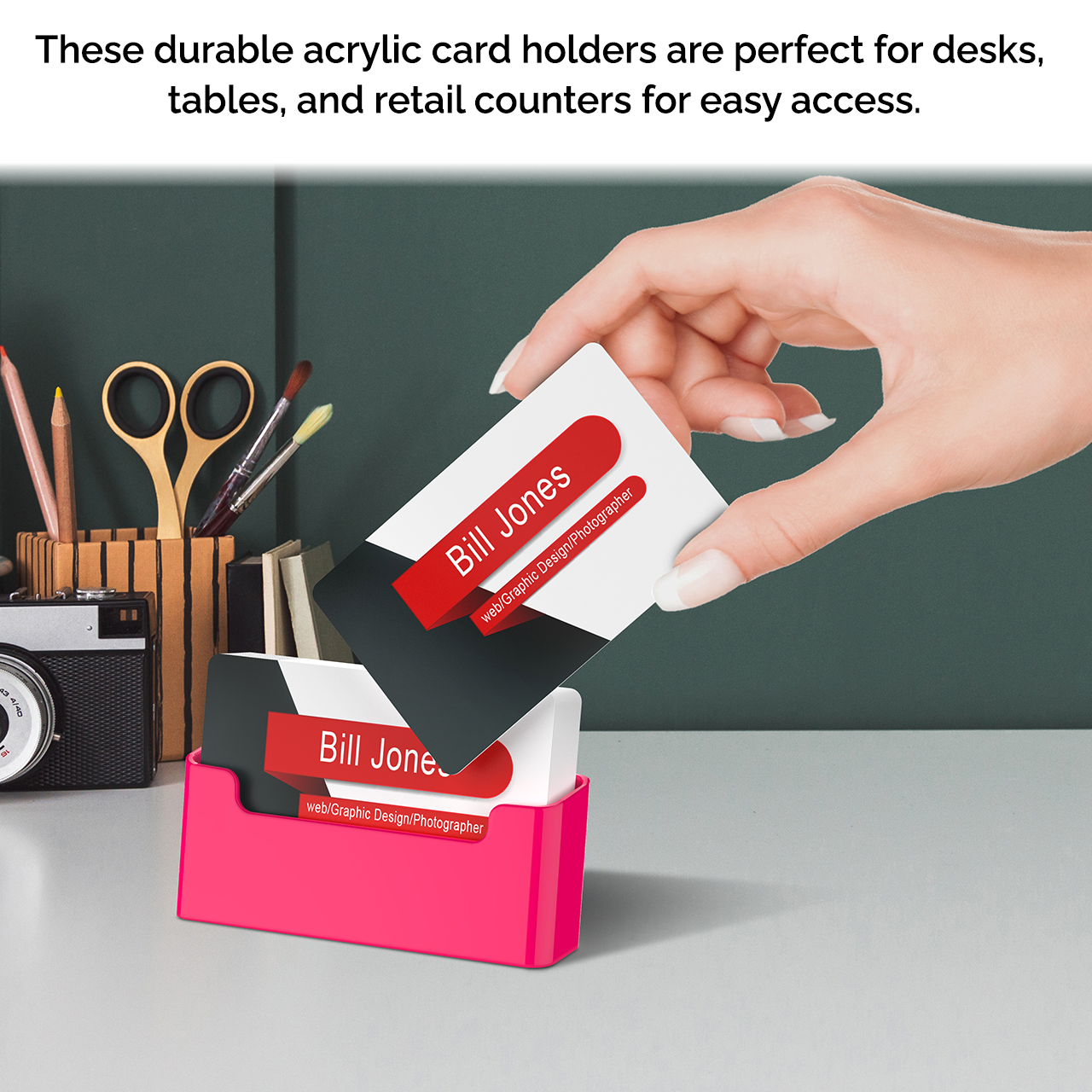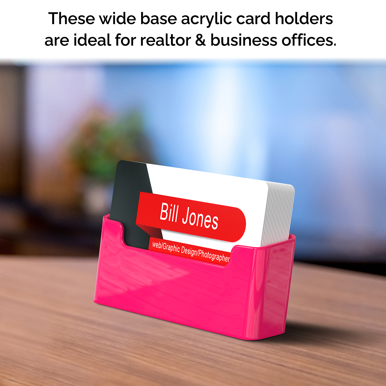 This bright pink freestanding business card holder is designed to hold and display business cards, gift cards, appointment cards or any other 3.5”W x 2”H printed material. Made of durable plastic acrylic, the card holder can be conveniently placed on desks, tables, retail counters or anywhere you want to leave your cards for customers to take one.