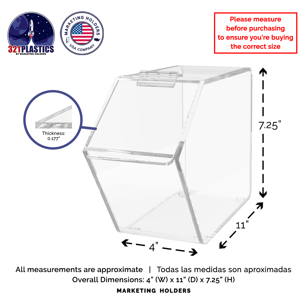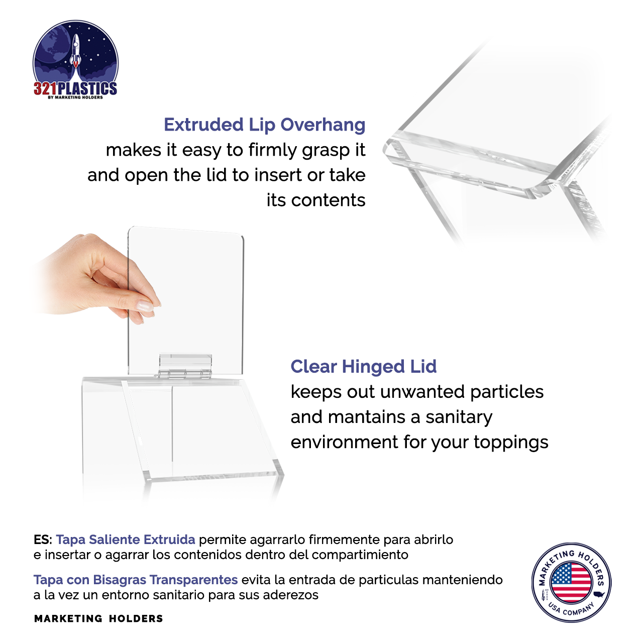 Our candy containers have a large opening for easy reach making them perfect for large events, cafeterias, hotels or expos. The flip-top lid provides easy access. This plexiglass candy bin is a must have addition to any ice cream parlor, candy store, bakery, cafeteria or breakfast buffet. Â