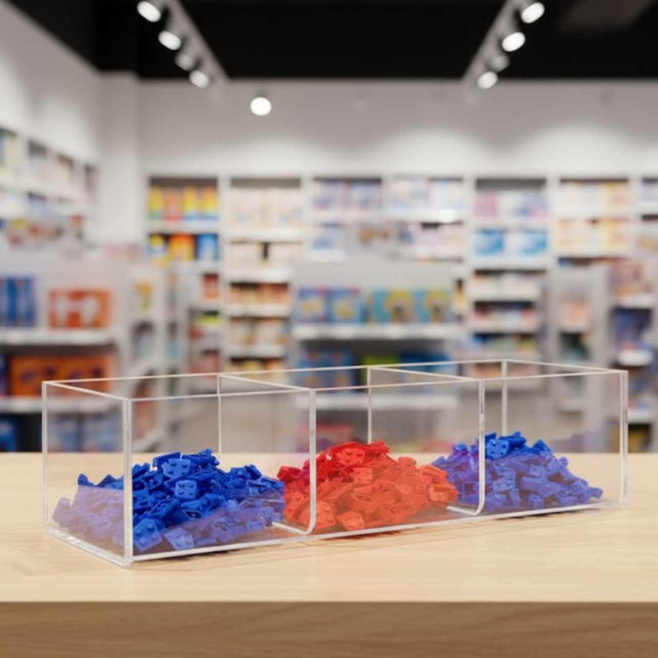 Marketing Holders clear acrylic storage bins are the perfect way to display and organize retail merchandise. The durable container has three compartments to keep products organized. The clear caddy combines style and functionality for many types of businesses and service stations.