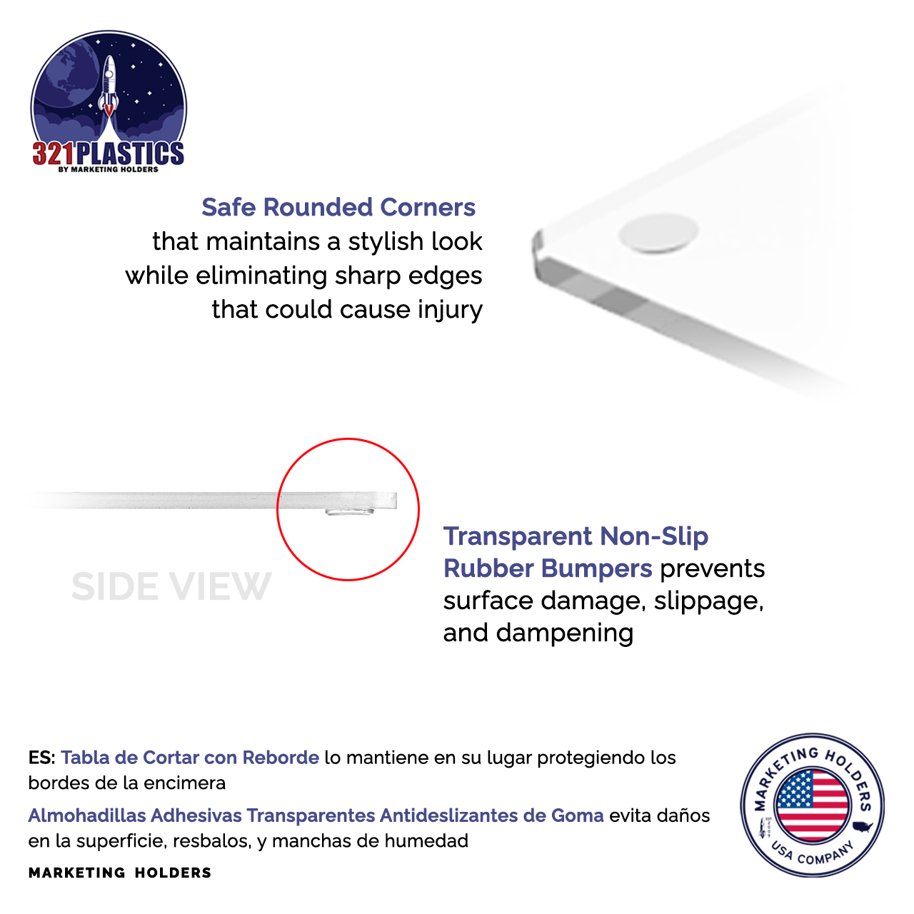 This lucite tabletop board includes 9 rubber feet to keep the acrylic shield in place while cutting and to prevent sliding reducing the chance of injury. The flat board sits neatly along the edge of your worktop making it easy to scrape peelings and other food debris directly off of the board into the trash. Our cutting board is easy to use on many different types of counters such as marble, granite, wood and metal.