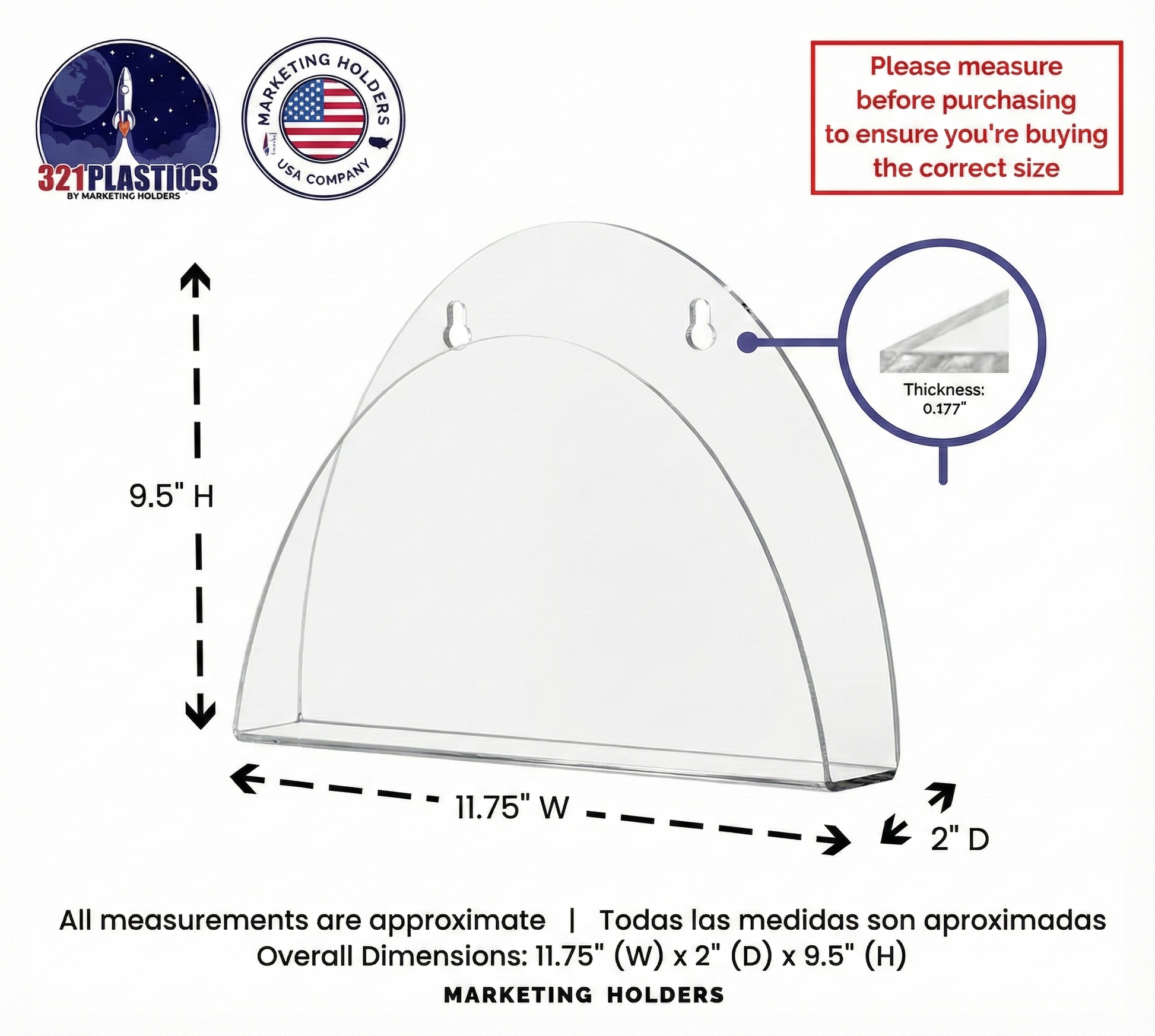 - Overall Dimensions: 11.75"W x 9.5"H x 2"D