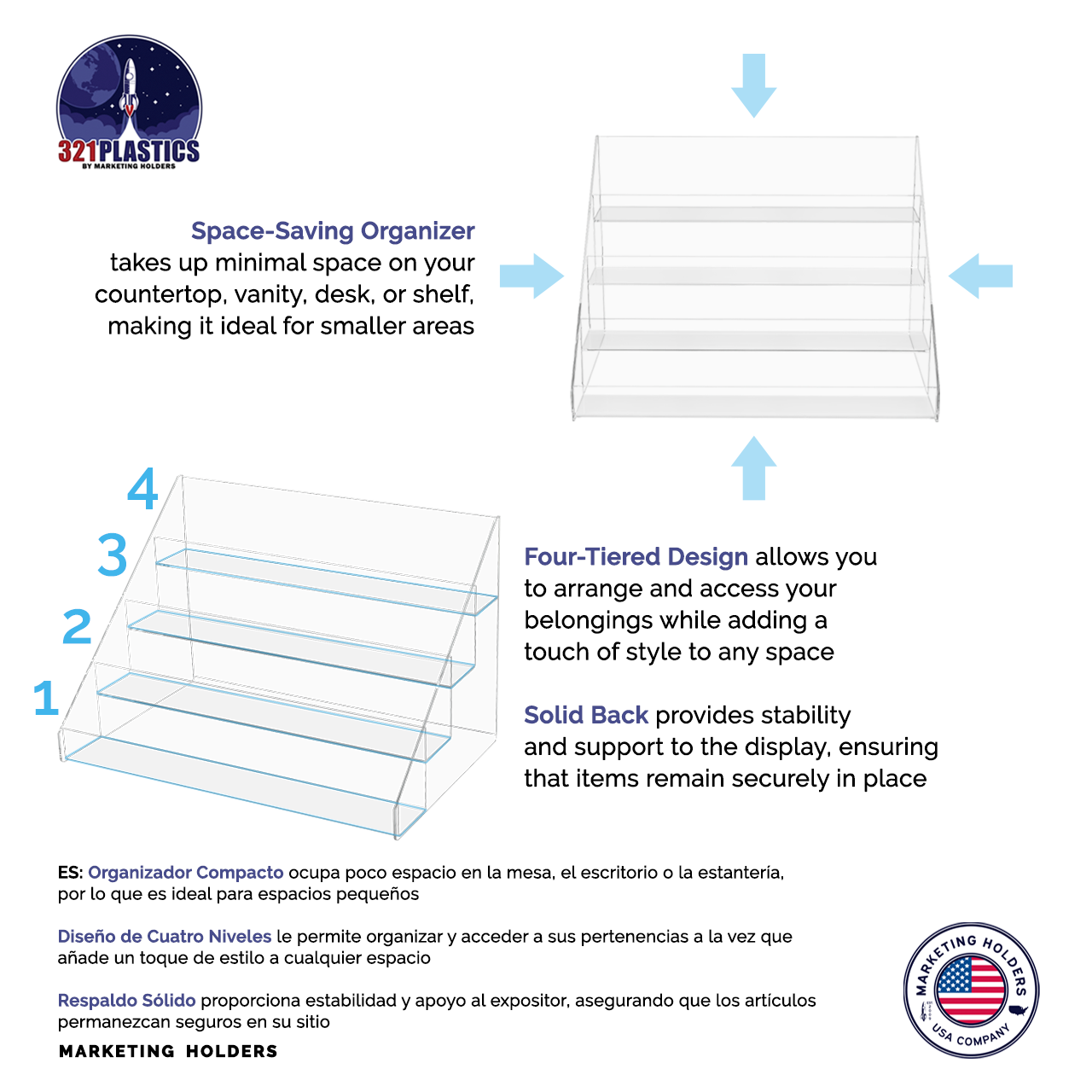- Space saver with 4 stacked levels to display various products with ease