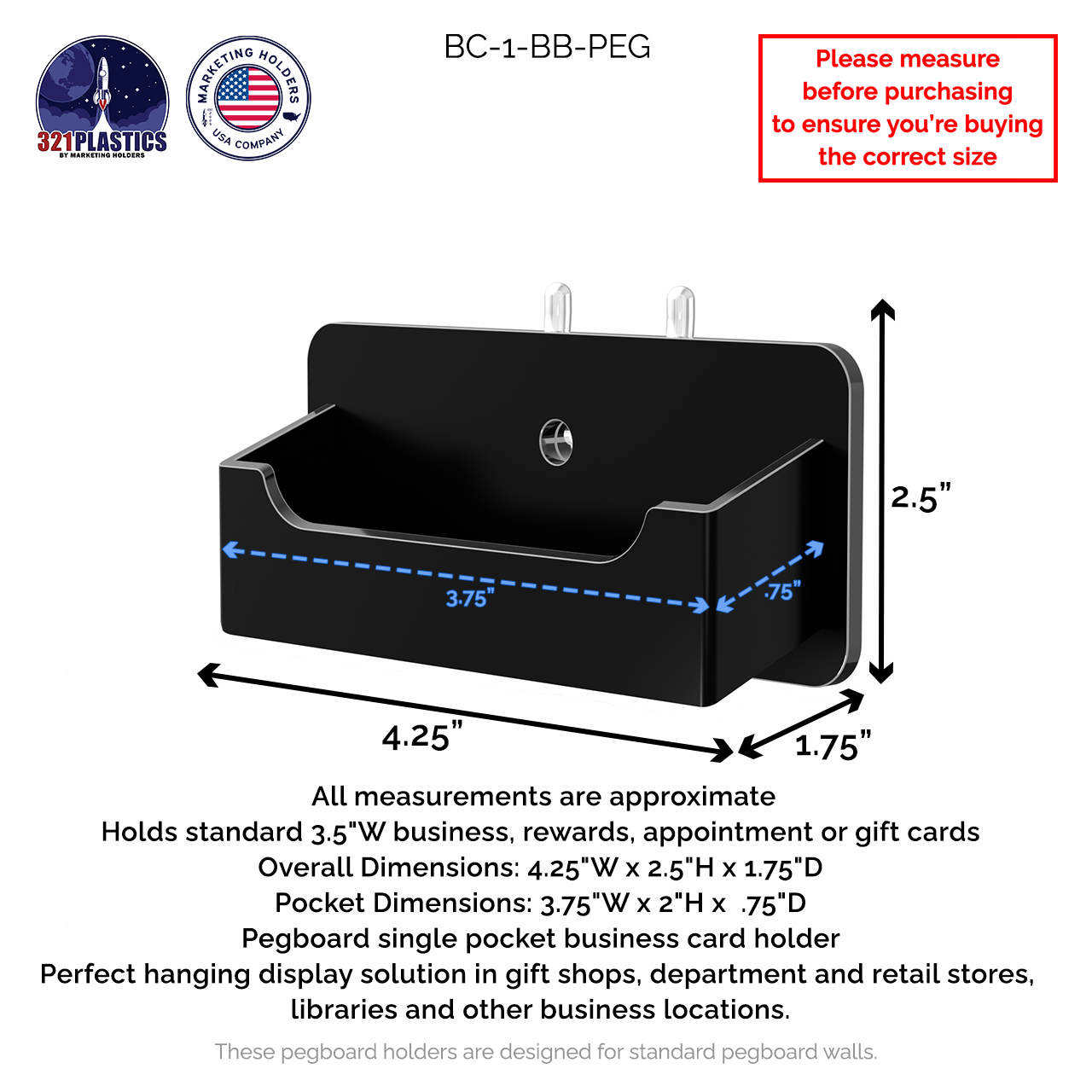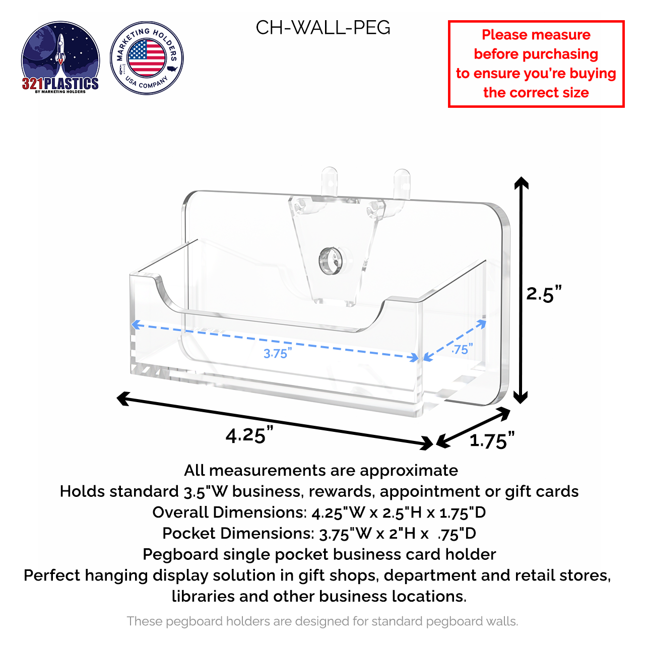 Pegboards are a unique wall design that allows retailers to set up product displays in interchangeable and efficient ways. This is a wonderful marketing tool because as products and promotions change, the wall can be reorganized. The pegboard wall card rack provides long-term durability in addition to keeping your 3.5 inch by 2 inch printed material neatly in the holder, and can be easily placed on most standard pegboard walls.