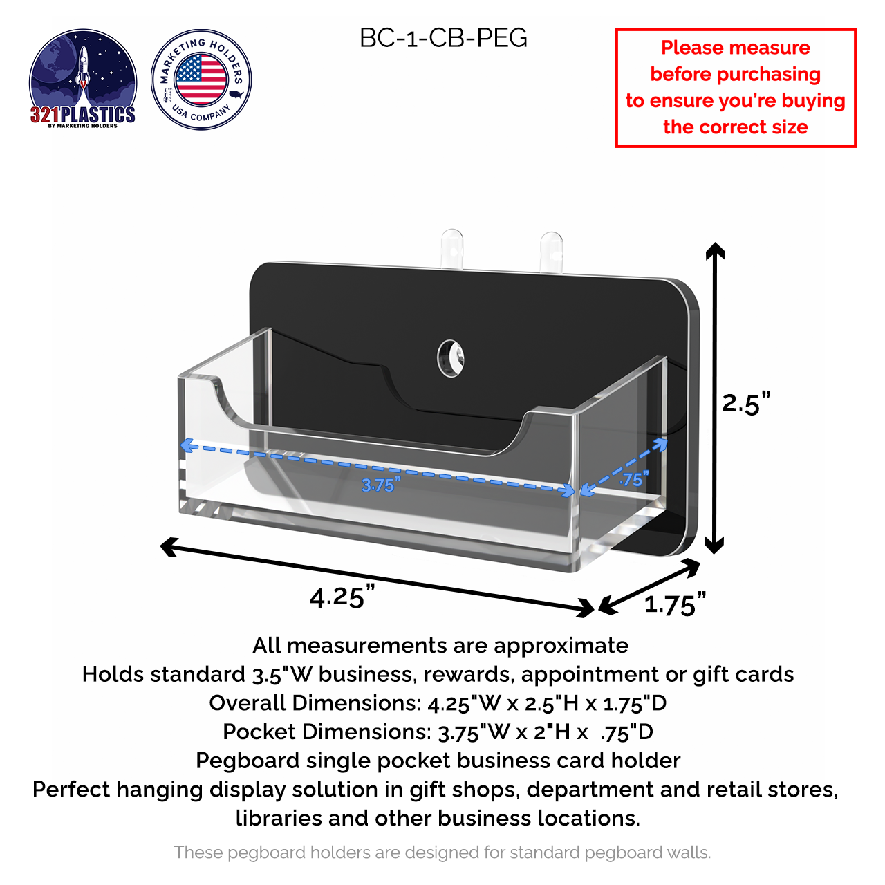 This single pocket peg board business card holder provides a sturdy display for business cards or gift cards that complements any decor. Looking for a convenient way to distribute contact information? Business card holders make spreading the word about the company's staff and professional services a breeze. Just one holder for personal info will ensure that calling cards are arranged neatly. The unique design of these products attaches to standard pegboard wall fixtures without the need for adhesives, tools, or hardware. The card pocket has a design that makes it easy for employees and customers to take one.