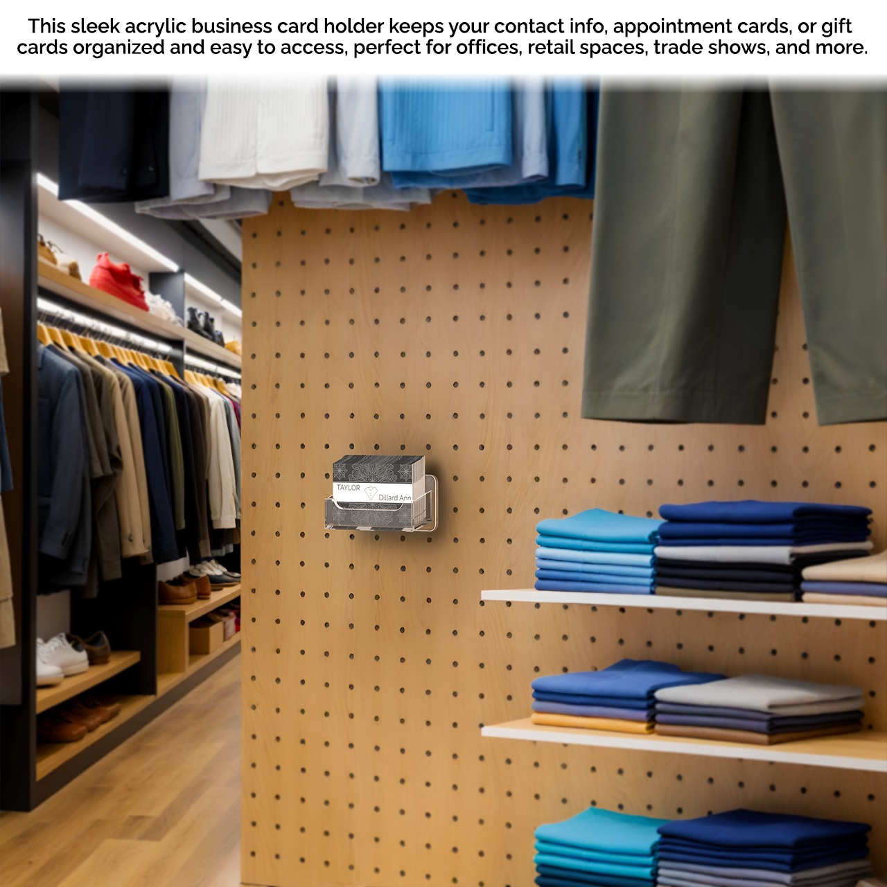 In addition to business information, the acrylic holders can also be used to display other small media like Security Gate Code Cards, Membership Cards, Appointment Cards, VIP Cards, ID Badges, Security Cards or Gift Cards. Store credit cards are often placed on pegboard walls near the register or checkout stand to increase clientele and expand the customer base. Other times, simple gift cards or doctor’s appointment cards are placed in the pockets.