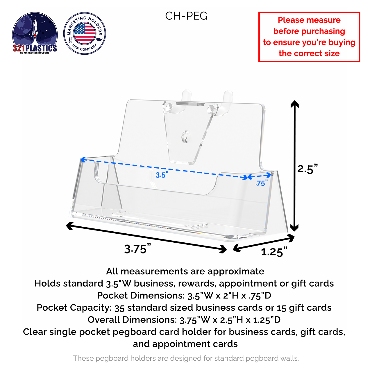 This wall pegboard single pocket business card holder is designed to hold and display one set of business cards in one convenient holder. The functional and space-saving design frees up precious countertop and desktop space while making your calling cards available to prospective customers for the taking. Made of durable acrylic, the card holder comes with one peg board hook for easy hanging and is a great way to display business cards in a multi-person office. Ideal for use in retail stores, community centers, travel agencies, airports and more!