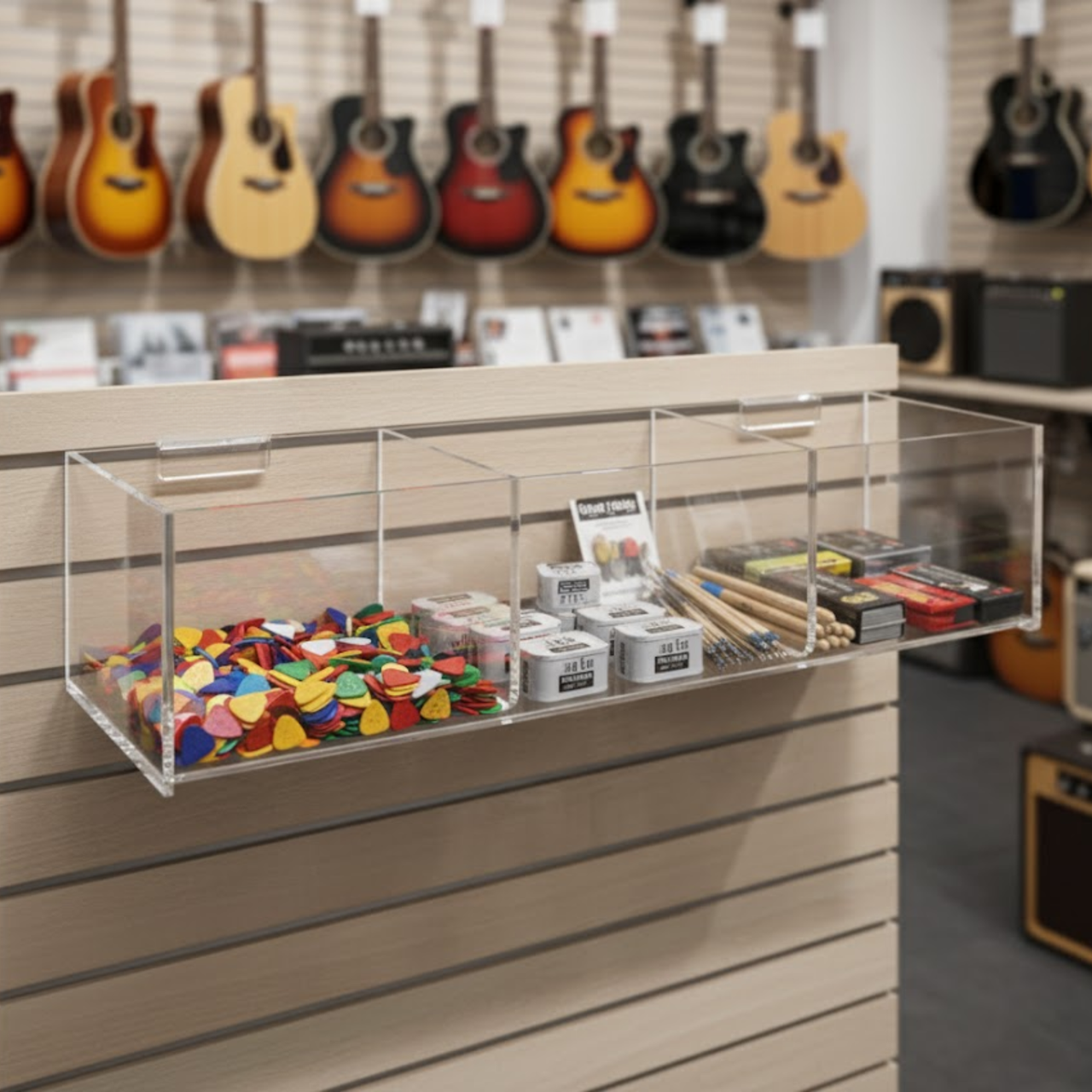 Slatwall 12"W Acrylic 3 Compartment Retail Product Storage Bin