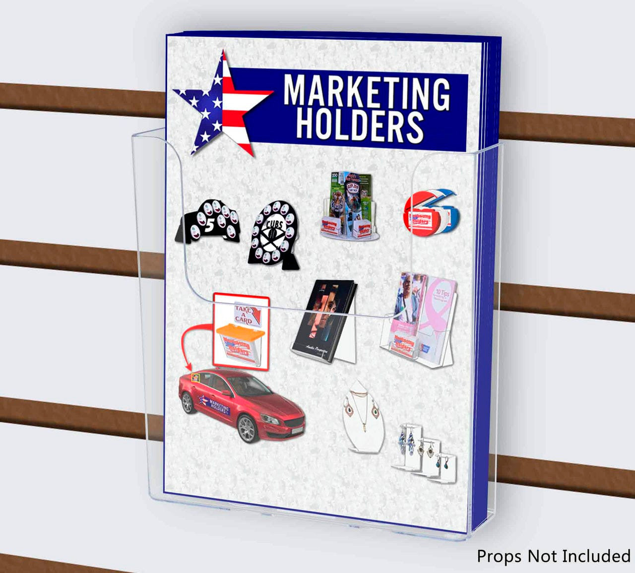 Marketing Holders literature holder provides a simple yet effective slatwall display for promotional literature, pamphlets, brochures, booklets and flyers. With this clear holder, your office or store slotted wall becomes an advertising tool! Many businesses find these marketing aids useful to spread the word about their upcoming promotions, products, services and events. Elegantly showcase attraction pamphlets or menus while saving space and keeping areas looking professional, clutter free and organized.