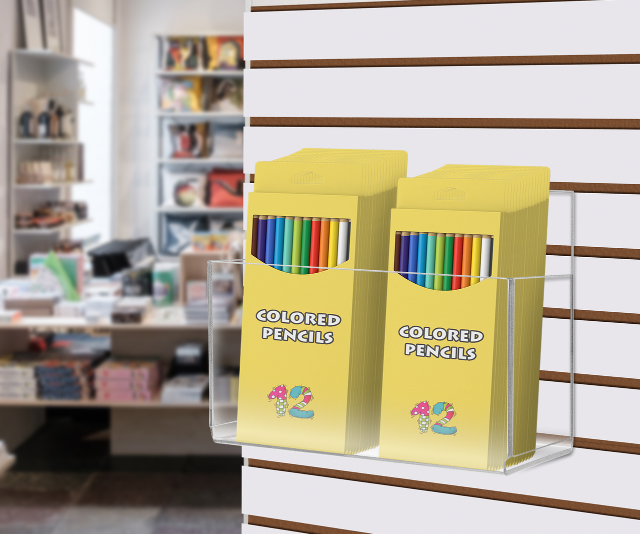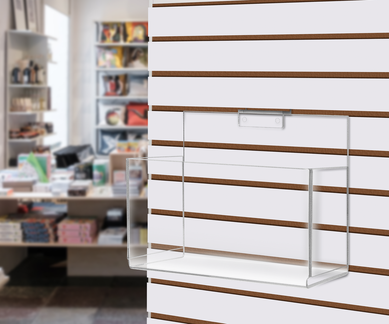 Customers will love the clear view that allows them to see the contents inside and appreciate a neat and clutter free slotwall display. This slatted wall tray adds style to any item without taking the attention away from the product. Place one or multiple trays by your front entrance to entice customers to purchase new, discounted or impulse items. Slatwall boxes are great to help conserve precious table or counter space in retail locations.Â