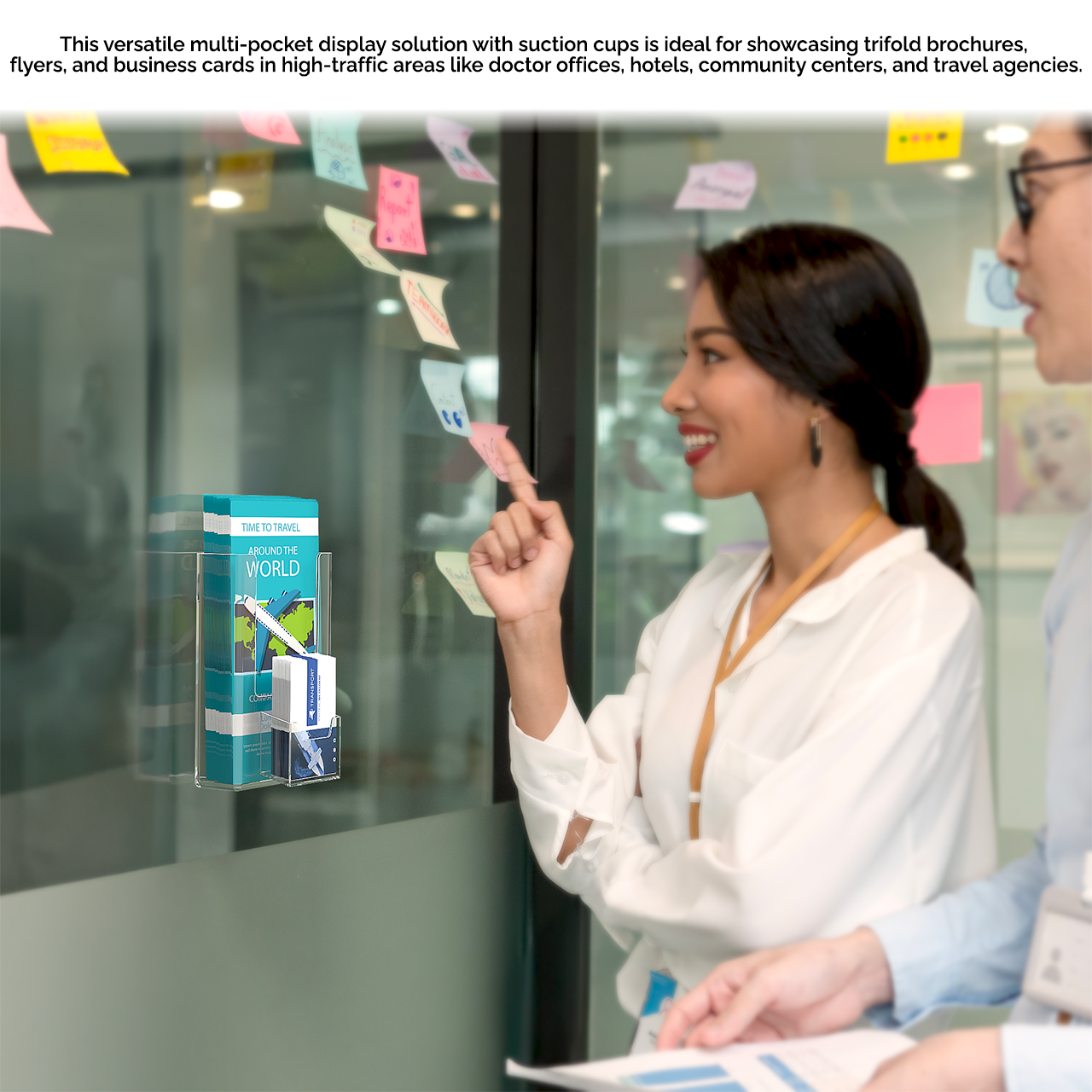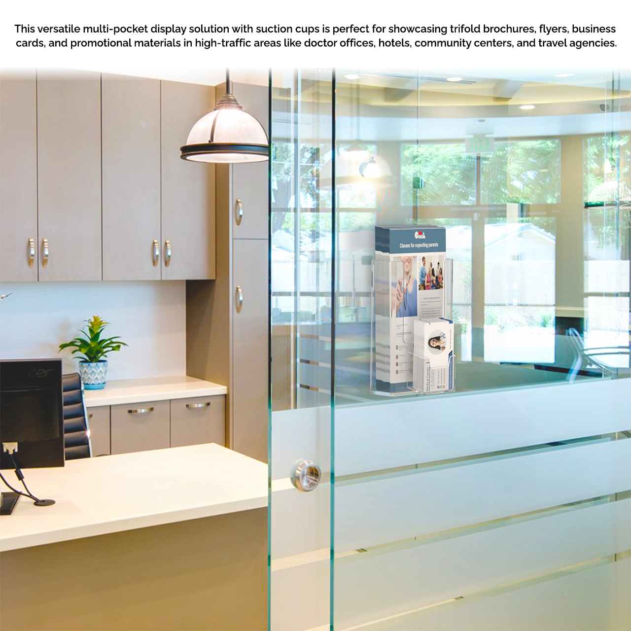 - Perfect multi pocket display solution with suction cups for trifold brochures, flyers, pamphlets, catalogs, advertisements and business cards