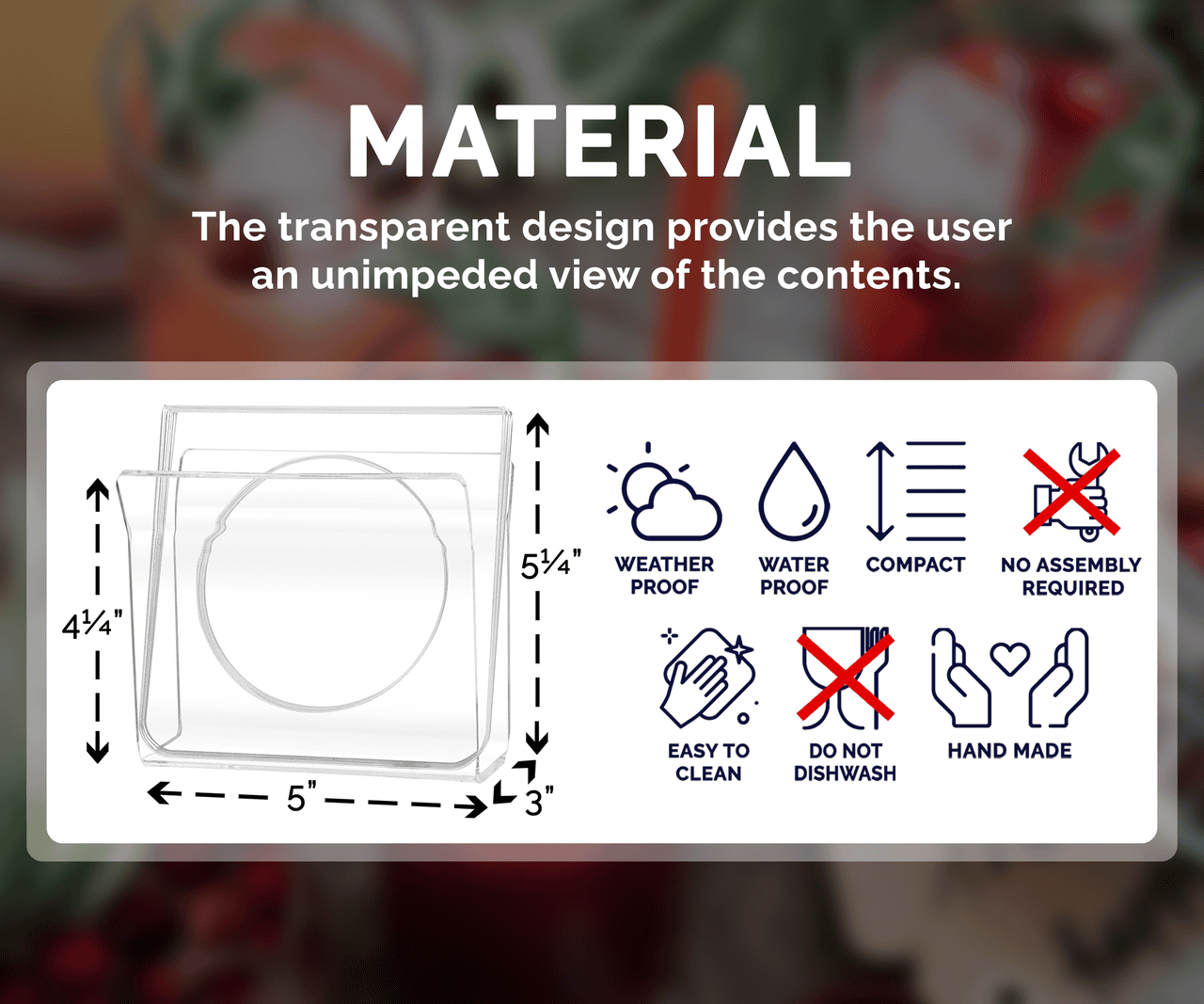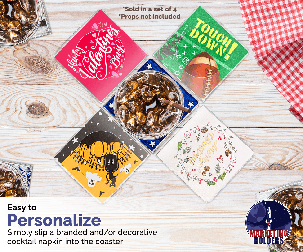 With a modern and elegant appearance similar to glass, our napkin holders will fit in any decor. One side of the coaster is closed leaving three sides open allowing you to slide in a cocktail napkin of your choice making it easy to change for each holiday!
