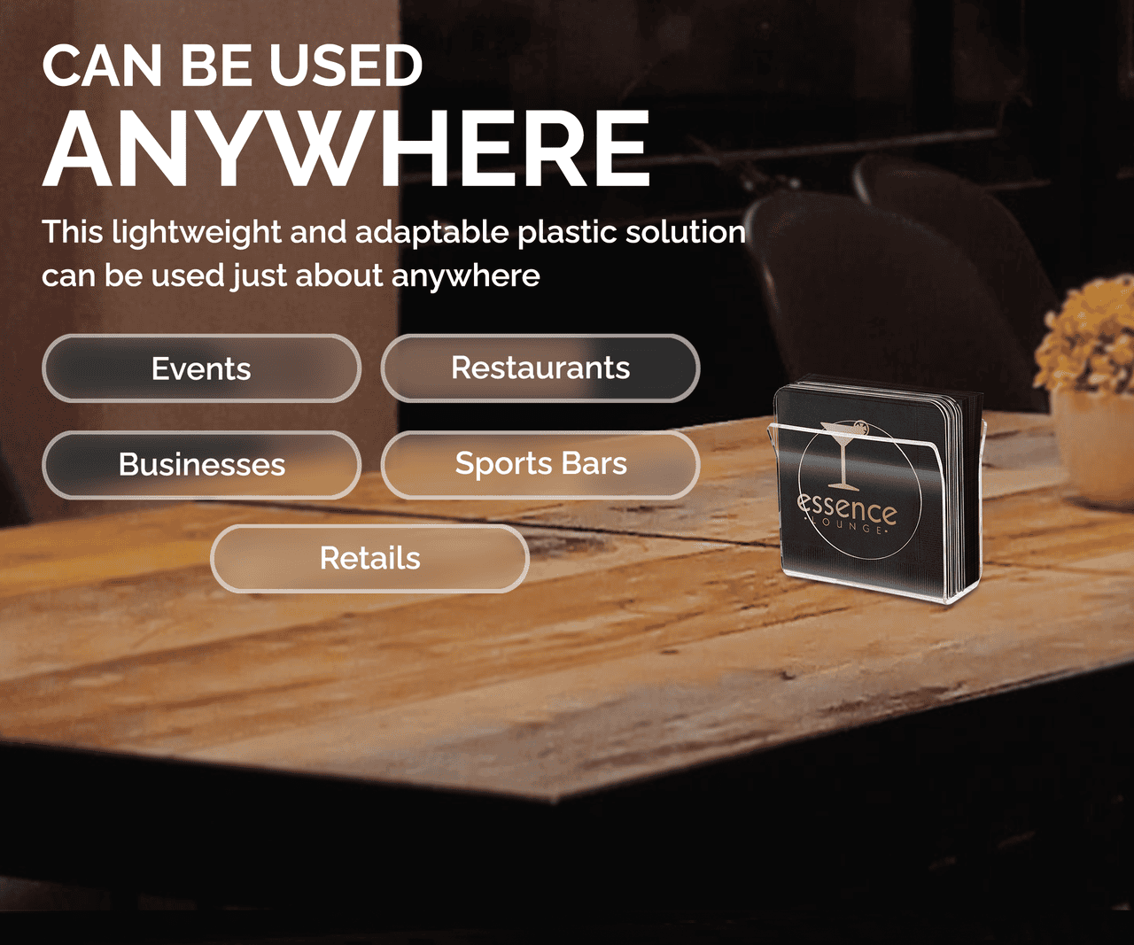 Marketing Holders clear acrylic cocktail napkin holders are perfect for any home, restaurant or event. The creative design makes these holders ideal to add elegance to any formal occasion such as weddings, anniversary celebrations, or receptions. These unique holders are a great addition to your holiday decoration. Simply add your holiday themed cocktail napkins to match each season. Great for entertaining at holiday parties and makes a great housewarming gift!Â
