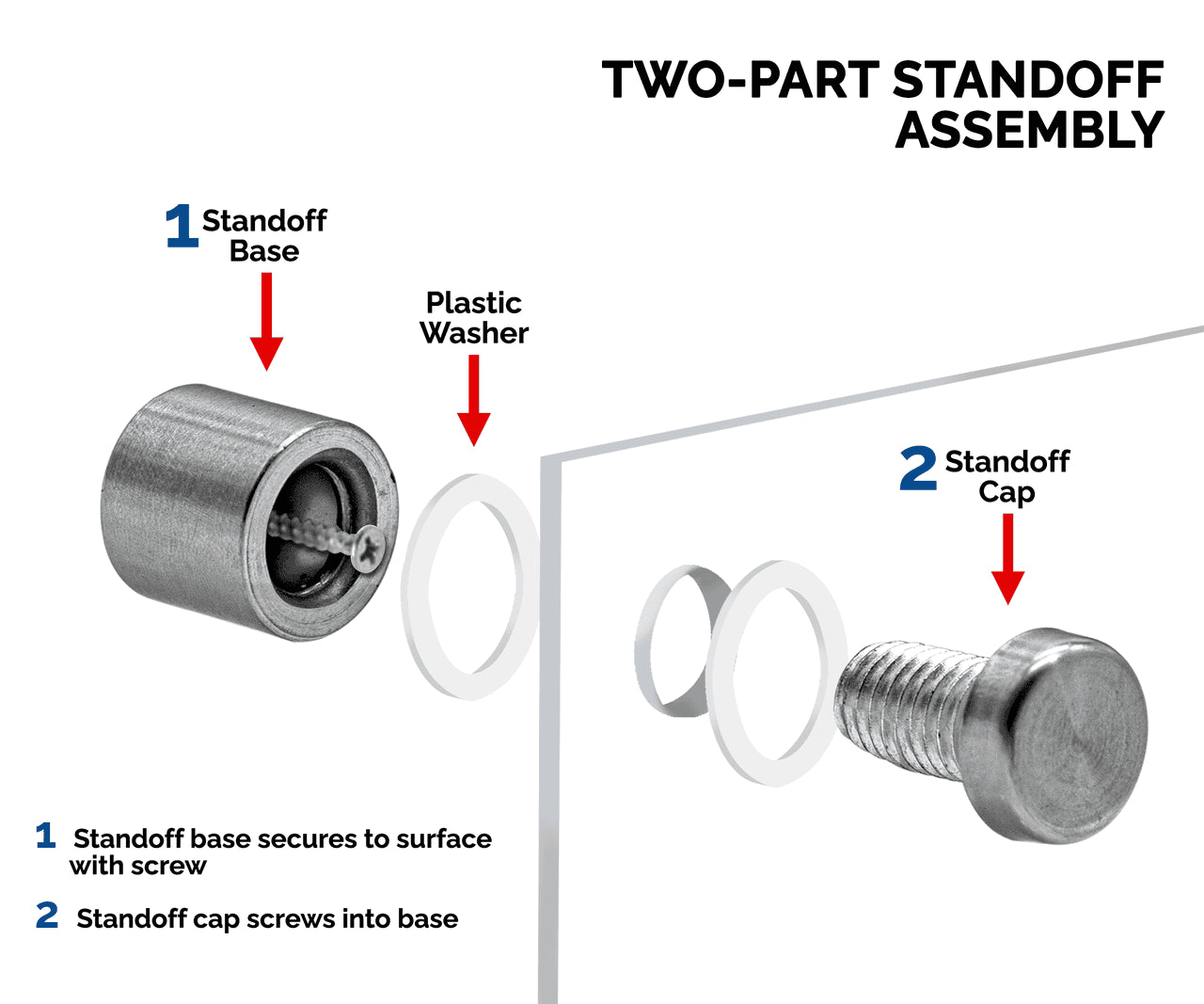 - Each sign holder will come with two 1" stainless steel standoffs and wall mounting hardware