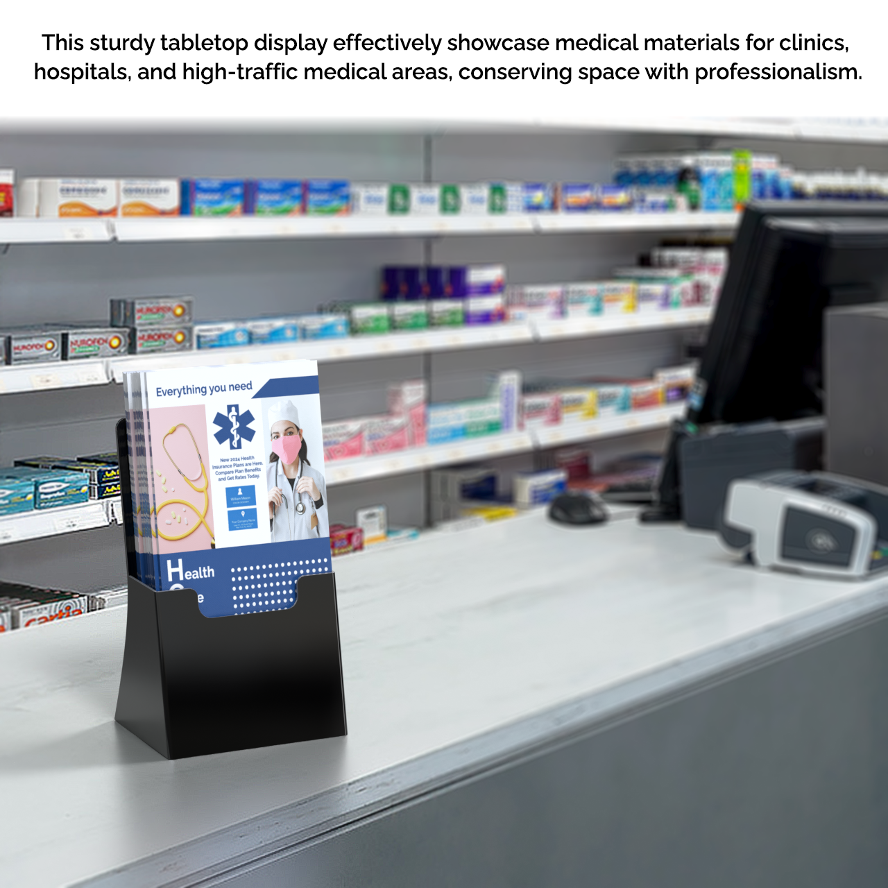 - Single pocket countertop display stand for trifold brochures, pamphlets, rack cards and leaflets