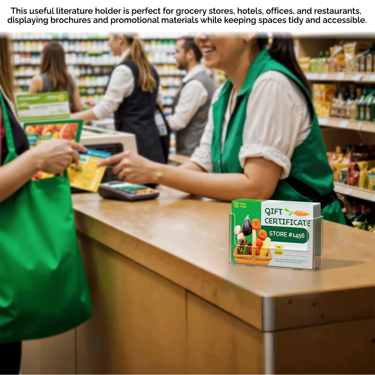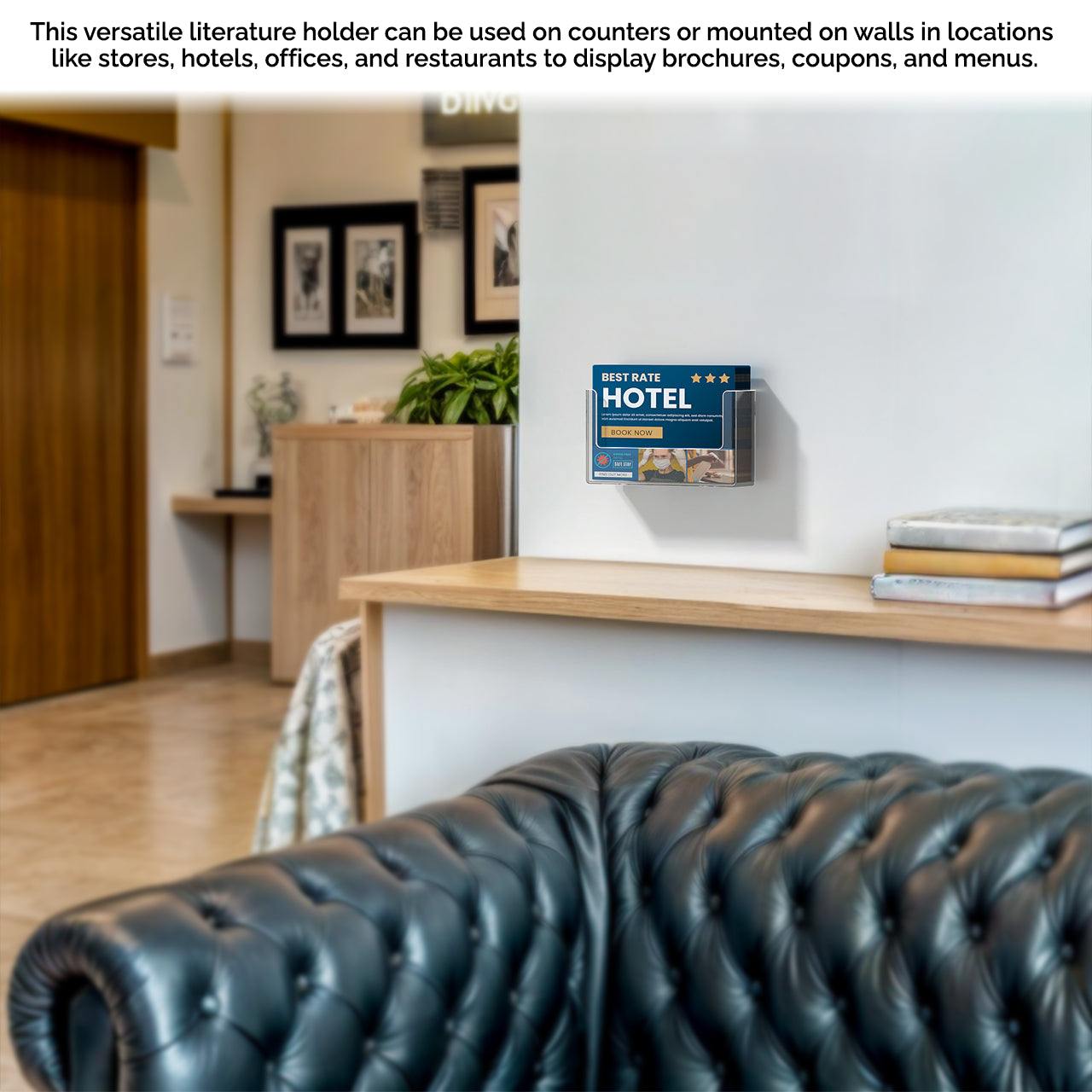 Marketing Holders literature holder provides a simple yet effective tabletop or hanging display for promotional literature, pamphlets, brochures and flyers. Many businesses find these marketing aids useful to spread the word about their upcoming promotions, products, services and events. These heavy duty stands can be used on flat surfaces such as tops of a table, counter or desk near entrances and exits or reception areas so customers are prompted to take one when visiting your business. This holder comes with 2 pre-drilled keyholes and is designed to easily hang on smooth surfaces if counter space is limited.  Elegantly showcase attraction pamphlets or menus while saving space and keeping areas looking professional, clutter free and organized. These multi use bins are versatile and can be used to store a variety of other items.