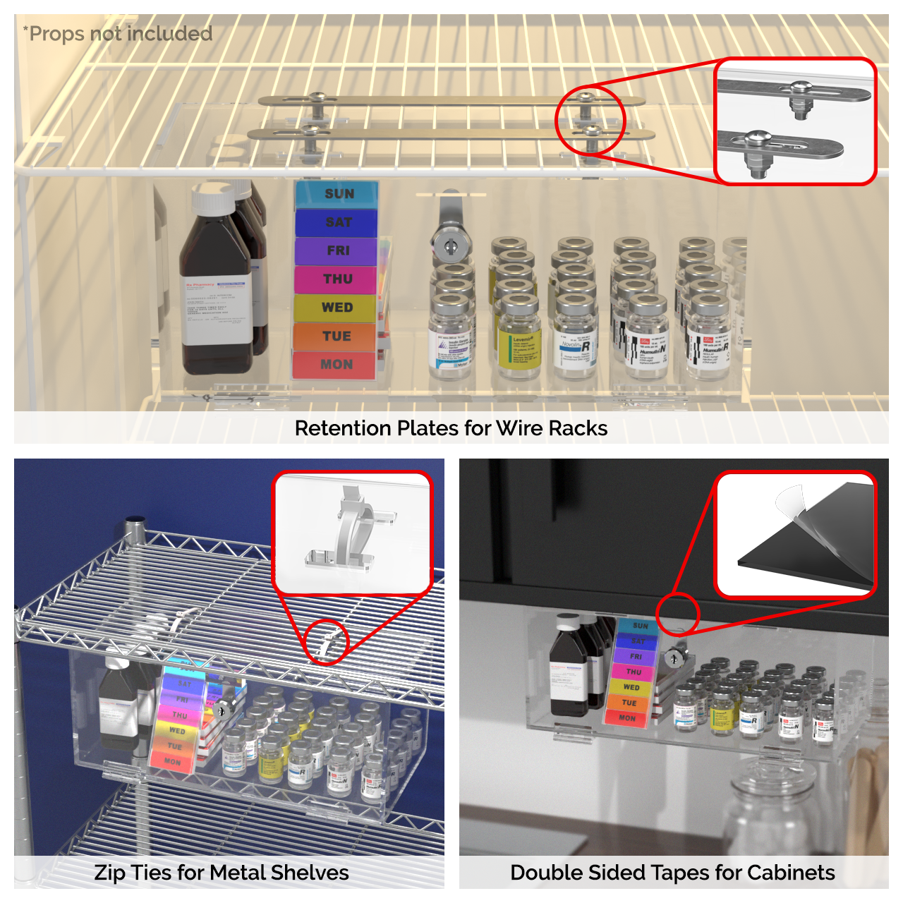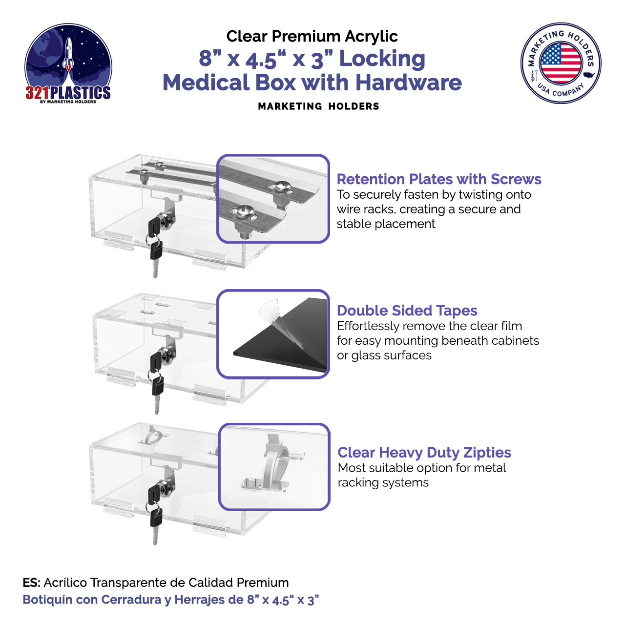 - This clear acrylic secure medical box includes two keys, adhesive, zip ties with mounting plate and hardware